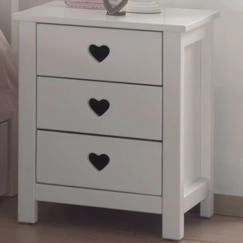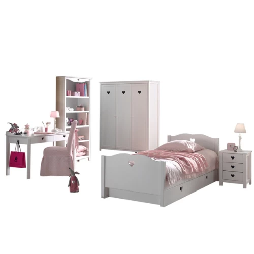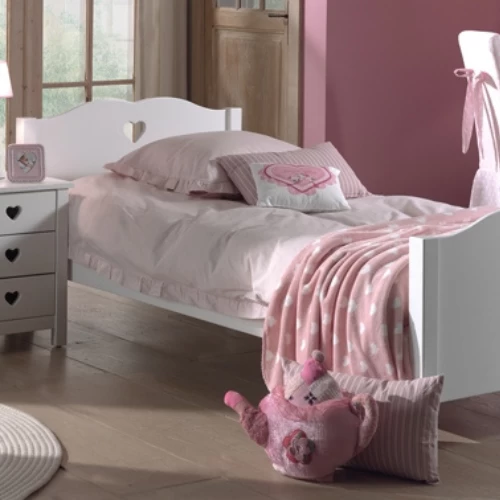 Laat je verleiden door deze lieflijke meisjeskamer Amori, een creatie van het gespecialiseerde merk Vipack, waar je dochter zich zonder twijfel helemaal thuis zal voelen. De schattige hartjes voorzien de kamer van een romantische finishing touch! Kinderkamer Amori bestaat uit een bed 90×200 cm (lattenbodem niet inbegrepen), een bedlade 90×200 cm een nachttafel 45x40x55 cm, 3-deurs kast 159x57x191 cm, bureau 130x60x85 cm en boekenkast 90x40x190 cm. Matras van 90×200 cm voor bed en bedlade niet inbegrepen.