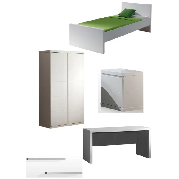 Het strakke en tijdloze design van kinderkamer Lara en de witte kleur maakt dat deze kinderkamermeubelen gemakkelijk een plekje zullen vinden in de meeste interieurs. Deze hedendaagse kinderkamer bestaat uit een bed 90×200 cm met lattenbodem (matras van 90×200 cm niet inbegrepen), een nachtkastje 44x40x48 cm, een 2-deurs kleerkast 110x57x205 cm, een bureau 150x76x70 cm en 2 hangplanken 100x24x5 cm.
