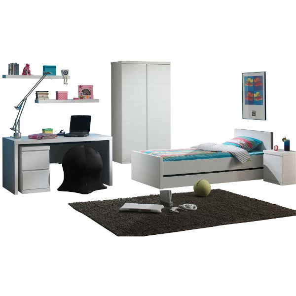 Het strakke en tijdloze design van kinderkamer Lara en de witte kleur maakt dat deze kinderkamermeubelen gemakkelijk een plekje zullen vinden in de meeste interieurs. Deze hedendaagse kinderkamer bestaat uit een bed 90×200 cm met lattenbodem en bedlade 90×200 cm (matrassen van 90×200 cm niet inbegrepen), een nachtkastje 44x40x48 cm, een 2-deurs kleerkast 110x57x205 cm, een bureau 150x76x70 cm, een ladeblok 60x40x66 cm en 2 hangplanken 100x24x5 cm.