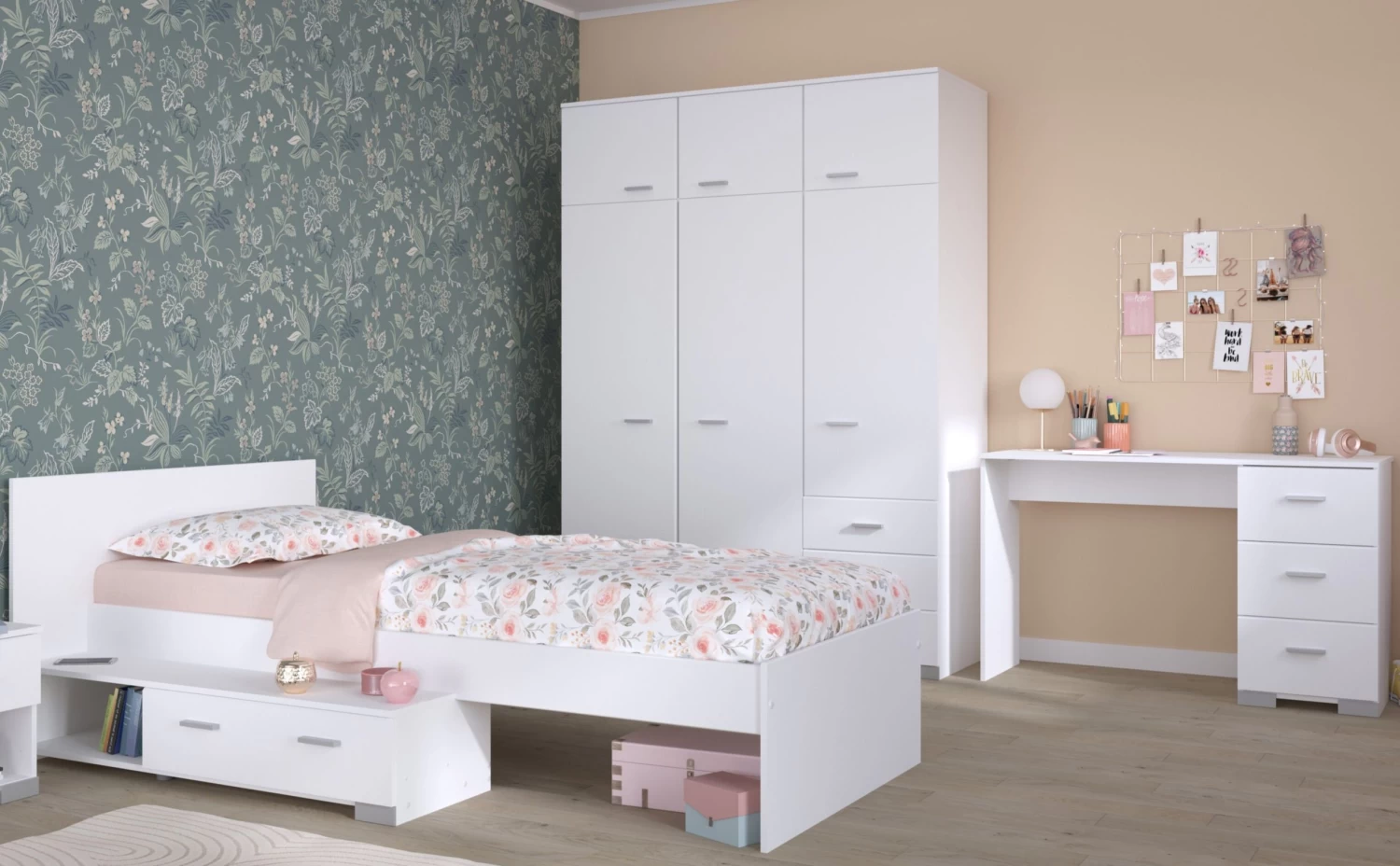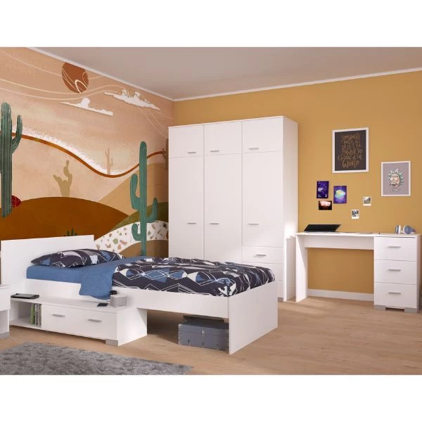 Creëer een dromerige kinderkamer met de Galaxy-serie. Dit complete setje, inclusief een eenpersoonsbed, een bureau en een kledingkast, voegt een vleugje speelse elegantie toe aan elke kinderkamer. Het witte design brengt een frisse en tijdloze uitstraling, perfect voor een inspirerende en rustgevende omgeving.