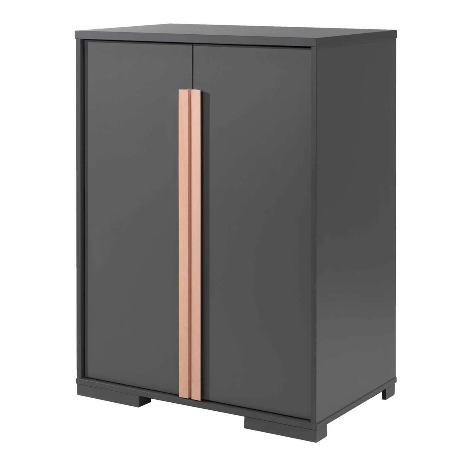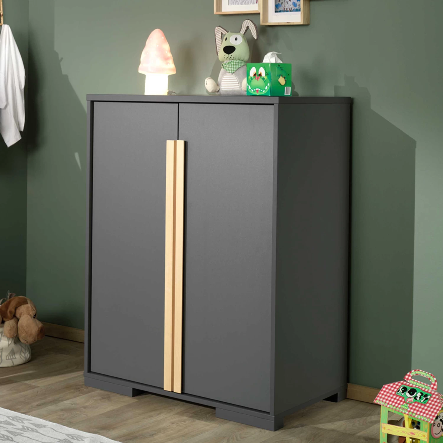 Deze stijlvolle, antracietkleurige opbergkast uit de London-reeks van het merk Vipack is gemaakt van hoogwaardig spaanplaat en is erg stevig. Achter de 2 draaideuren beschik je over 2 verstelbare legplanken om kledij, speelgoed of andere spullen op te bergen. De lange, verticale handgrepen uit massief beukenhout maken het makkelijk om de kast te openen en sluiten en zorgen voor een warme toets.