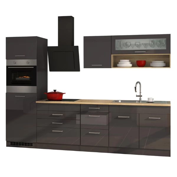 De keuken is één van de belangrijkste ruimtes in je huis. Daarom is het belangrijk om een keuken samen te stellen die qua stijl en functie volledig bij jou past. De keukenkasten Ragnar zijn gemaakt uit MDF. De afwerking in hoogglans antraciet en de metalen handgrepen zorgen voor een moderne look. Deze opstelling bestaat uit twee hangkasten met wandrek, een gootsteenkast, een onderkast met drie lades, een dampkap, een onderkast met drie lades en een kookplaat en een keukenkast met een oven en koelkast. De collectie Ragnar bestaat ook in hoogglans wit.