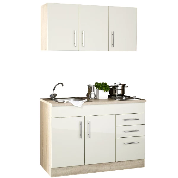Heb je slechts beperkte ruimte voor een keuken, of heb je nood aan een compacte keuken voor je (thuis)kantoor. Dan zijn de kitchenettes Toto iets voor jou. Deze kitchenette is gemaakt uit spaanplaat afgewerkt met melamine in hoogglans crème en eiklook. De opstelling bestaat uit twee hangkasten, een gootsteenonderkast en een onderkast met drie lades en een vitrokeramische kookplaat. De kitchenettes Toto bestaan in verschillende uitvoeringen. Zo vind je zeker een volledig naar jouw smaak.