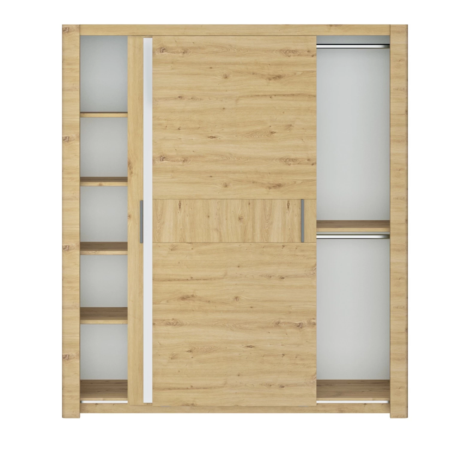 Deze ruime kledingkast bestaat uit twee deuren, waarvan één spiegeldeur. Achter de gewone deur vind je 2 kledingroedes en 1 grote legplank. Achter de spiegeldeur vind je 4 legplanken om t-shirts, truien of broeken weg te leggen.