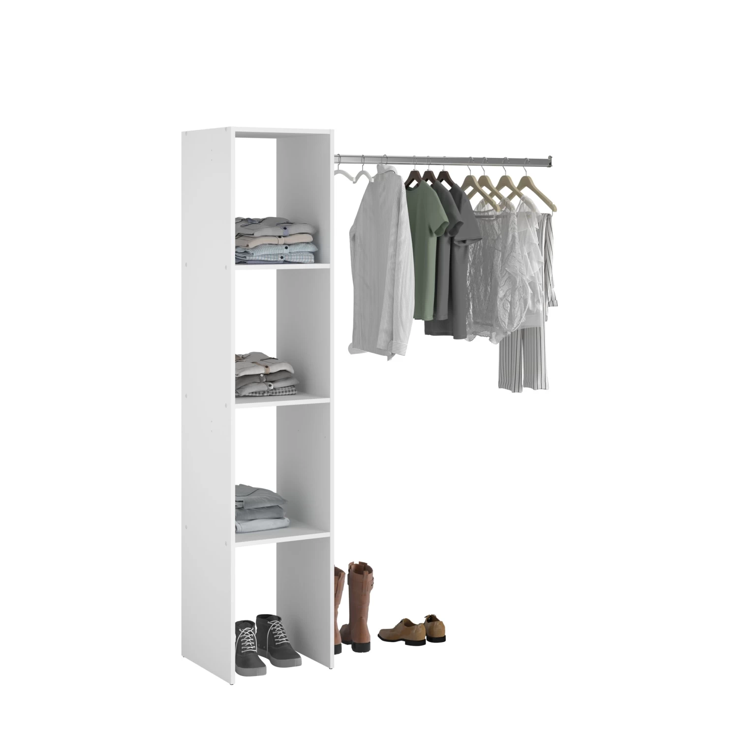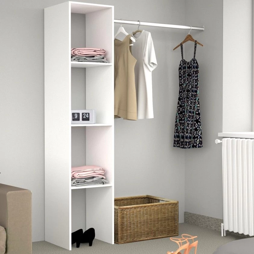 Deze kast is gemaakt uit spaanplaat met een witte afwerking uit melamine. Ze is uitgerust met drie legplanken en één kledingroede. De bedoeling is dat je de kast aan de muur bevestigd zodat deze stevig staat.