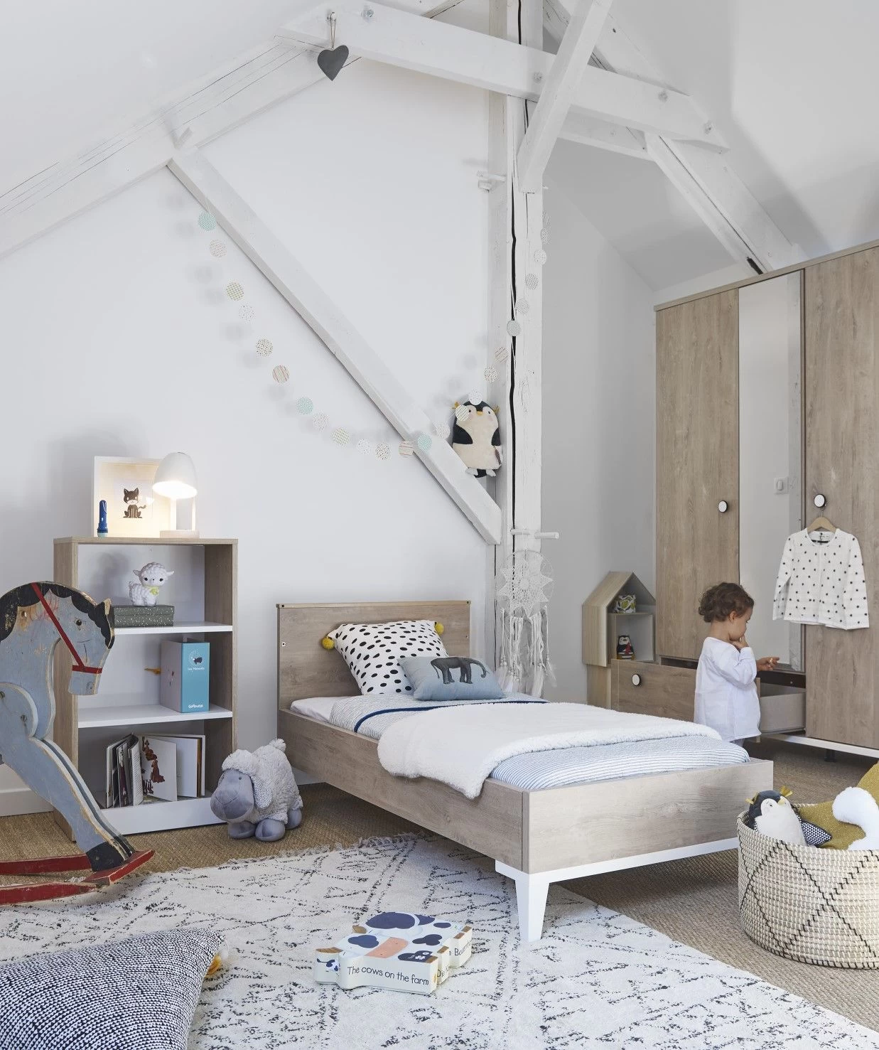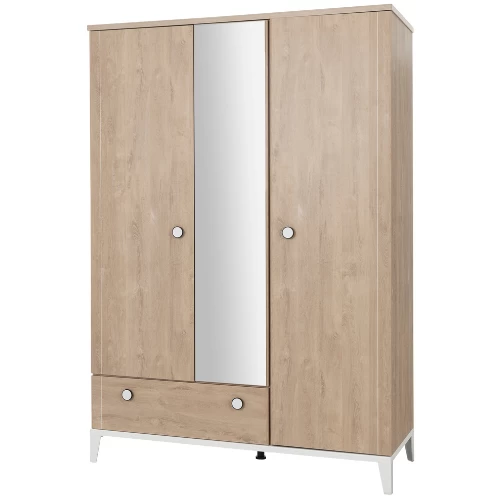 Combineer opbergruimte en gezelligheid met de meubelen van de Ciana-reeks. Deze zijn gemaakt uit spaanplaat en afgewerkt met eikdecor en witte accenten. Je kleintje kan zichzelf bewonderen in de spiegel van deze kleerkast met drie deuren. De spiegel is gemaakt van zilverkleurig glas met een beschermende folie. In twee delen beschik je over een legplank en een kledingroede om alle babykleertjes op te bergen. Onderaan vind je een extra lade voor bijvoorbeeld bedlinnen. De witte pootjes en handgrepen zijn eigen aan de Ciana-collectie en geven een speelse touch aan de kast. De deuren hebben schokdempende remmen voor een soepele sluiting.