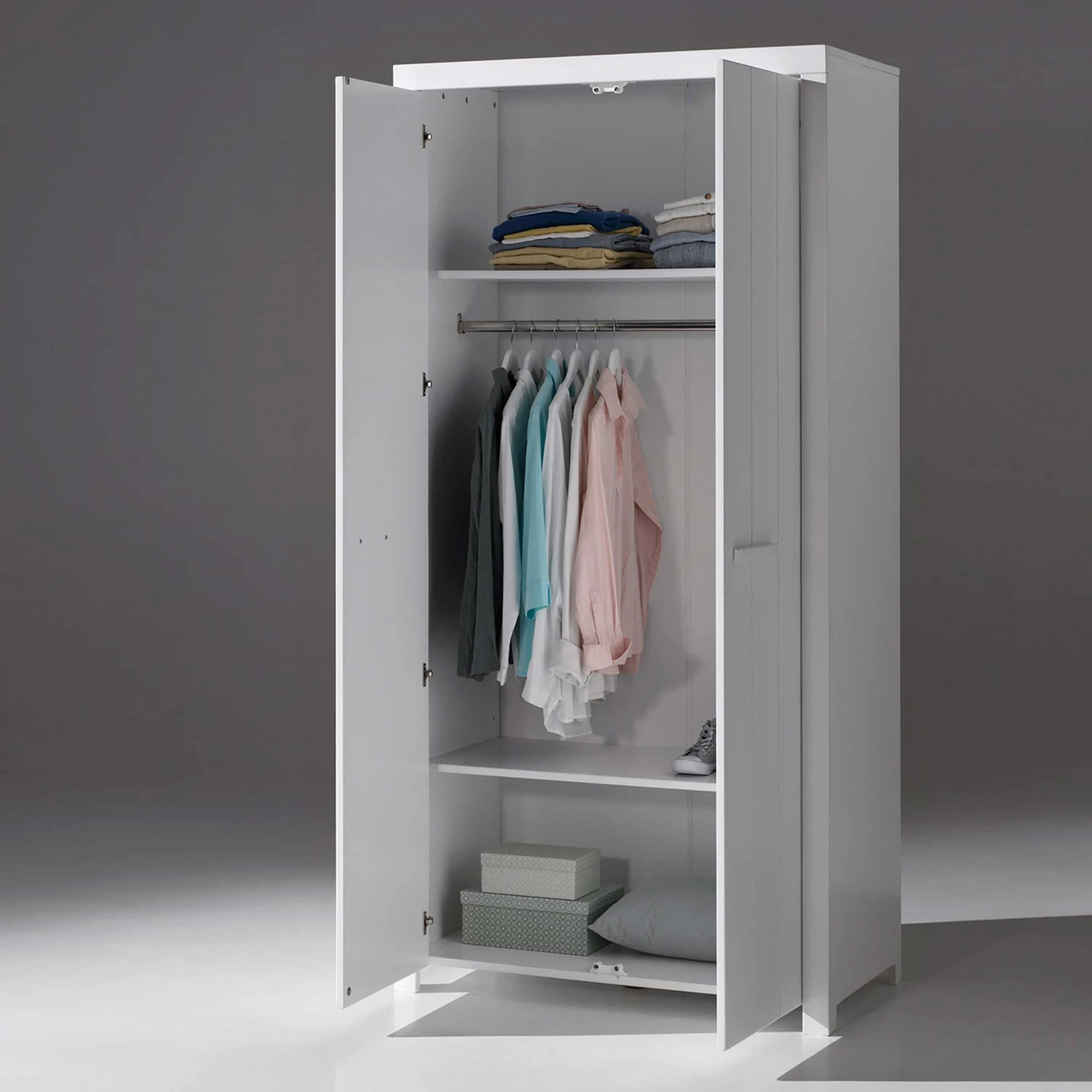 Daarnaast beschikt de kast ook over een kledingroede en twee legplanken zodat je voldoende mogelijkheden hebt om je kleren op te bergen.