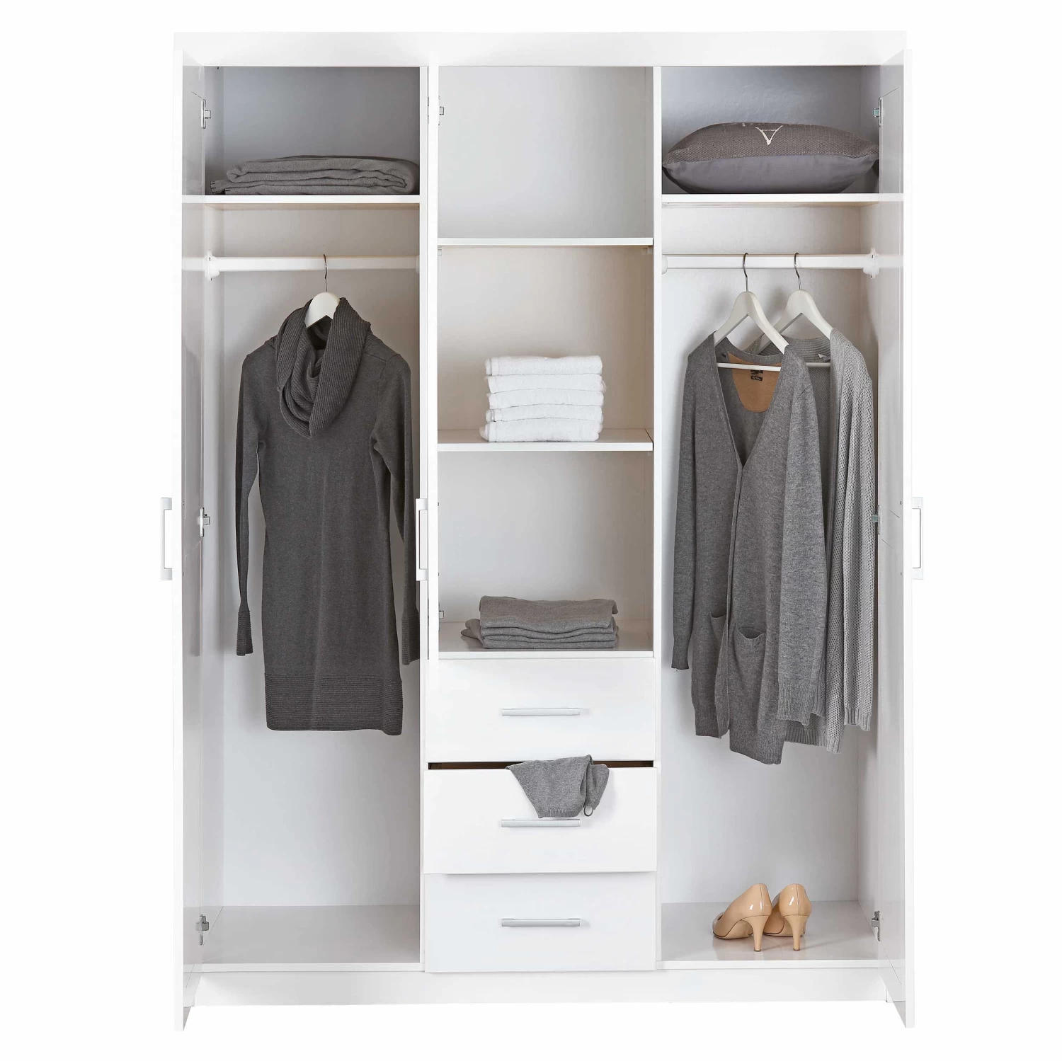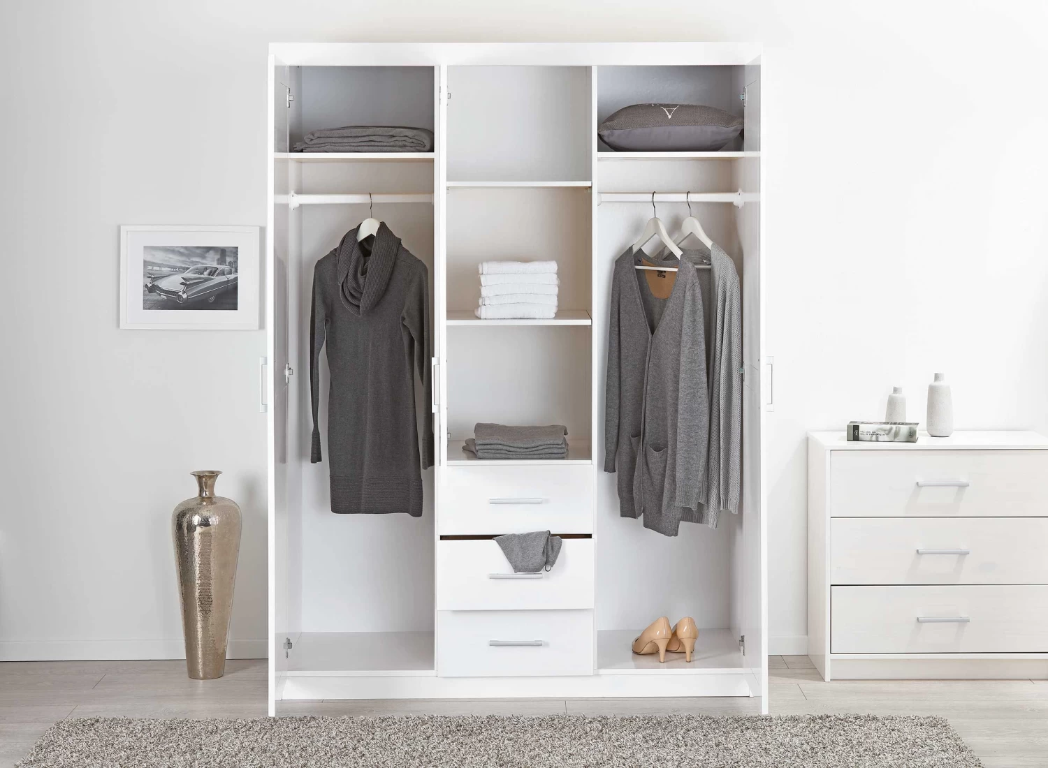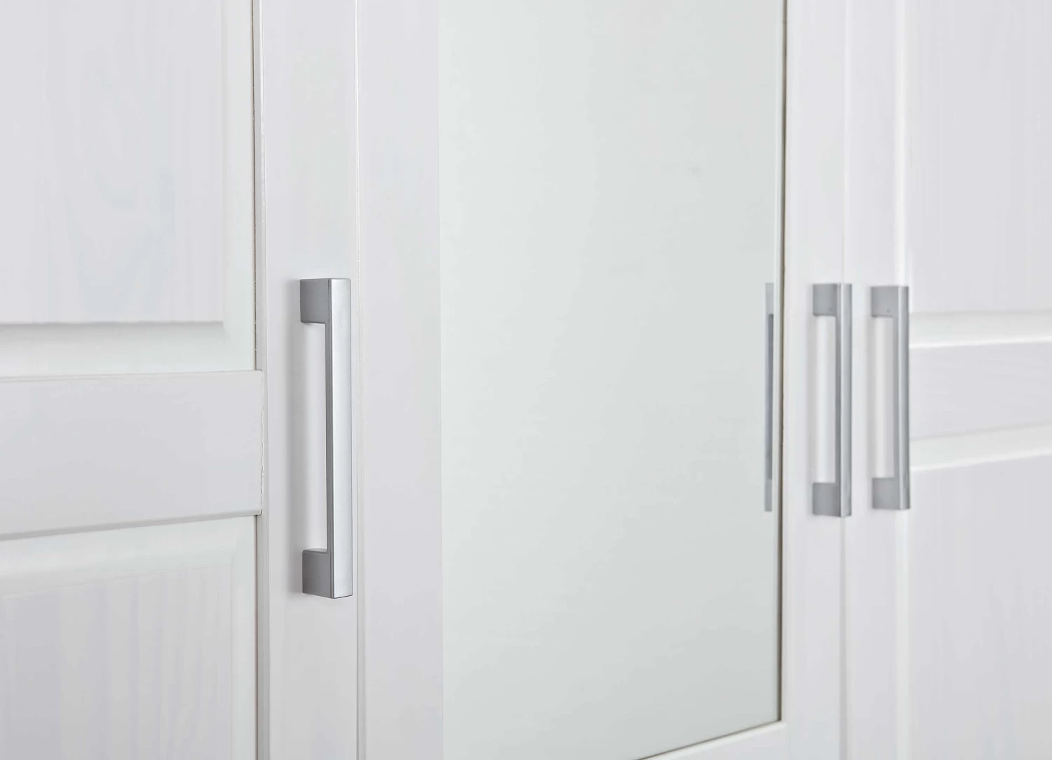 Kledingkast Geraldo is de perfecte kledingkast voor hem en voor haar. Die kledingroede hoeven jullie vanaf nu niet meer te delen, achter de linkse en rechte deur vinden jullie namelijk een identieke indeling en dus evenveel plaats voor jullie kleren. Naast een roede beschik je elk nog over een legplank bovenaan. Enkel de middelste deur kan nog voor discussie zorgen met 3 compartimenten. De deur is uitgerust met een handige spiegel. Eronder vind je nog eens 3 laden.