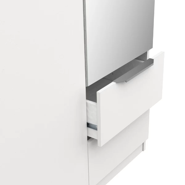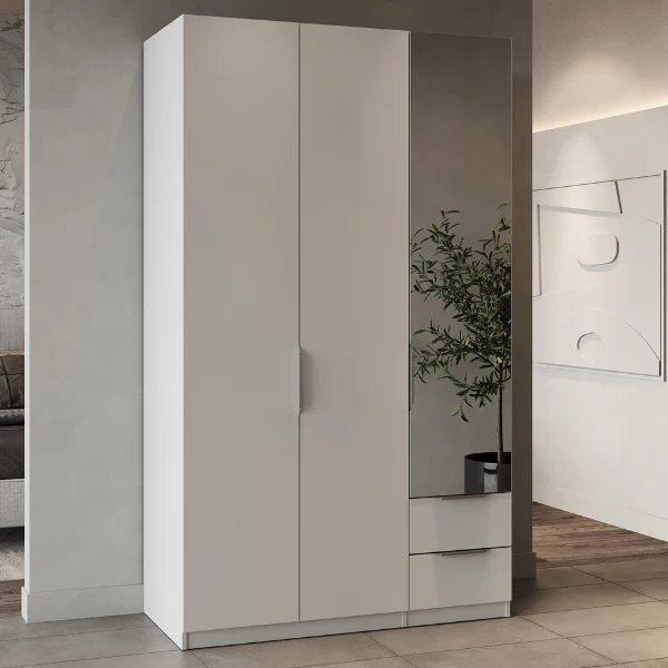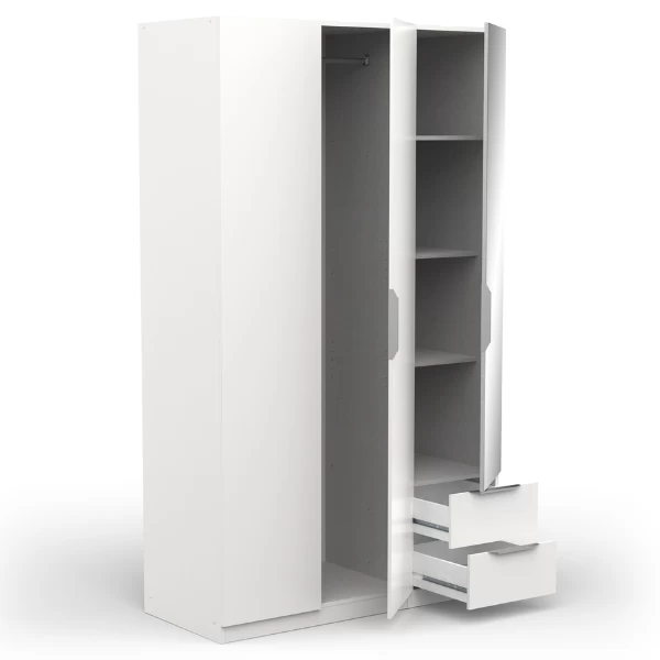Garderobekast Spectre 120×51.4x203cm uit spaanplaat afgewerkt met melamine in mat wit en aluminium handgrepen. Met spiegeldeur en twee opberglades. Uitgerust met een kledingroede en drie legplanken.