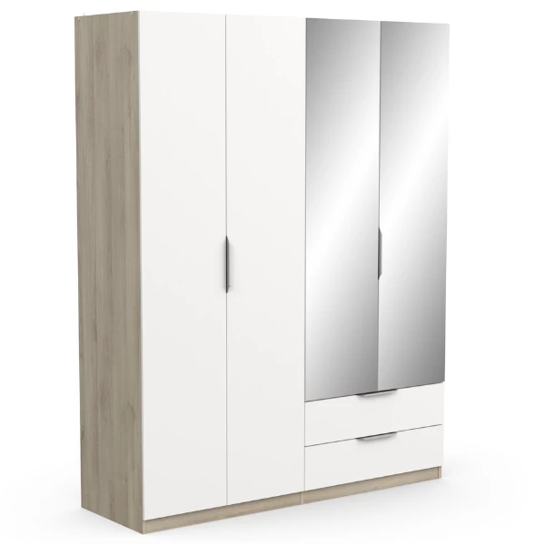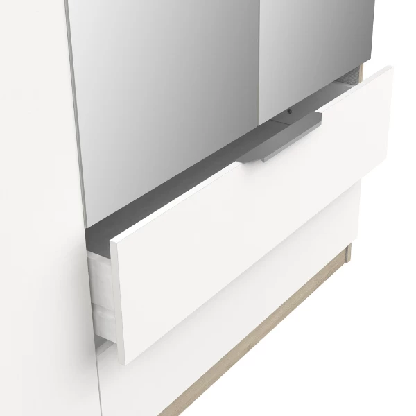 Kledingkast Spectre 157×51.4x203cm uit spaanplaat afgewerkt met melamine in mat wit en eikdecor en aluminium handgrepen. Met twee spiegeldeuren en twee opberglades. Uitgerust met een kledingroede en drie legplanken.