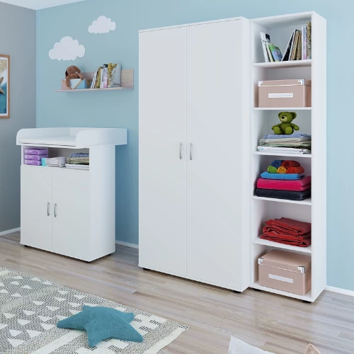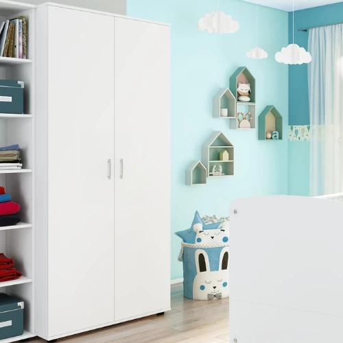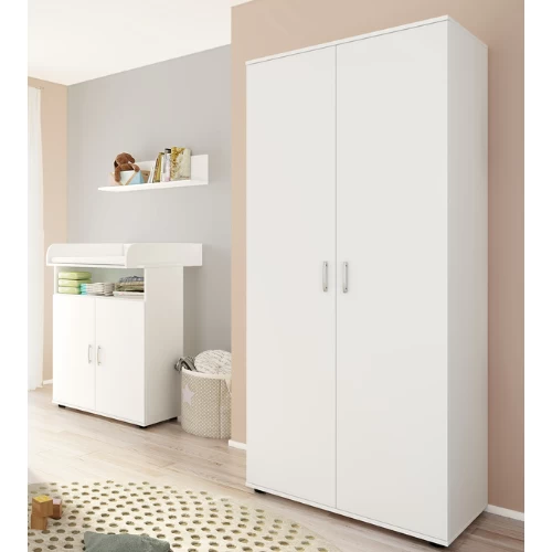 Deze eenvoudige, witte kleerkast bestaat uit 2 draaideuren met daarachter 1 kledingroede en 2 legplanken voor de kledij van uw kindje. Deze kleerkast maakt deel uit van de Halula babykamer maar kan ook gemakkelijk gebruikt worden in elke andere babykamer dankzij zijn neutrale witte kleur en ontwerp. Het neutrale ontwerp maakt ook dat u deze kleerkast kunt blijven gebruiken naarmate uw kind ouder wordt. Bekijk ook onze andere meubelen van de Halula babykamer. Schroeven en pluggen voor wandmontage zijn niet inbegrepen.