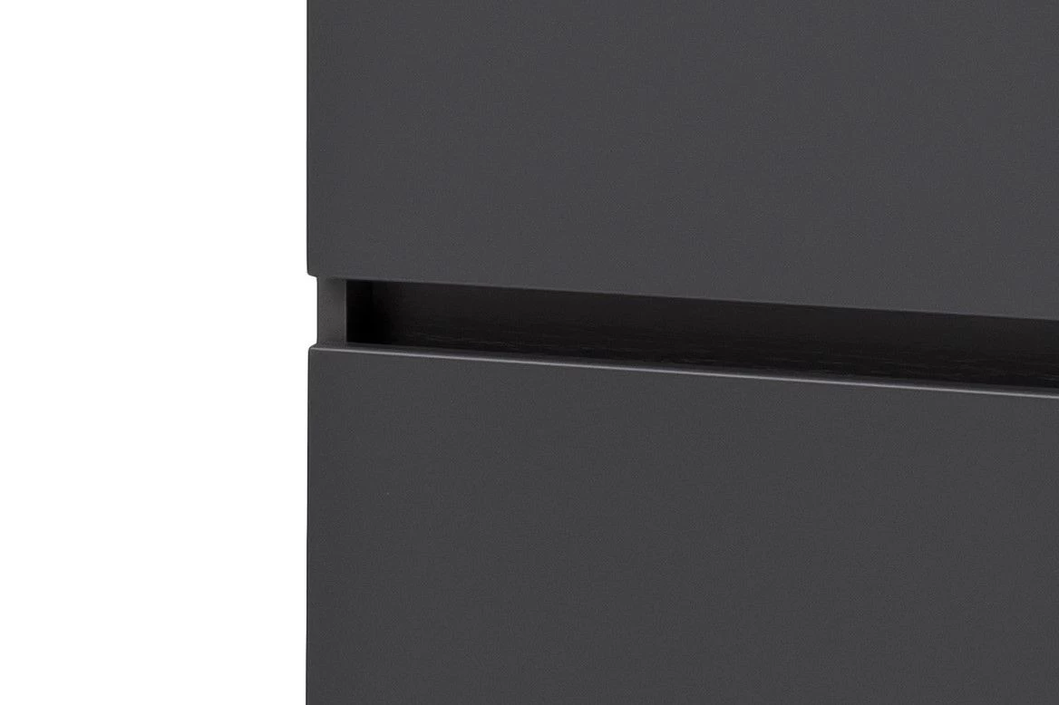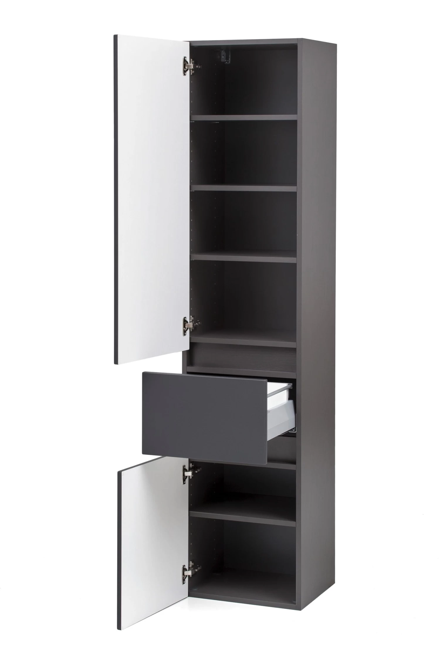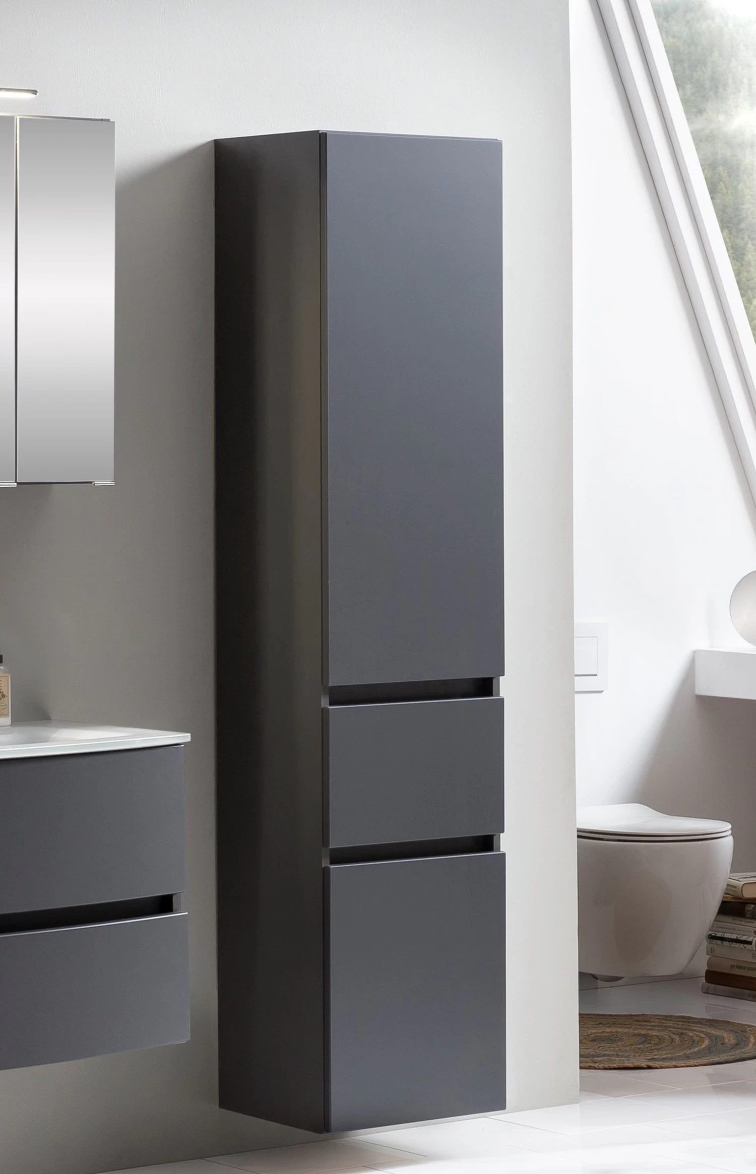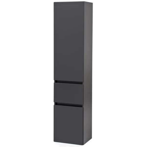 Met de meubelen van de Kornel-collectie kan je eindeloos combineren om zo jouw ideale badkamer samen te stellen. Deze grafietgrijze kolomkast is 40 cm breed en is gemaakt van gemelamineerde spaanplaat. De kast is uitgerust met 1 softclose lade en 2 deuren. Beide hebben een matgrijze afwerking. Dankzij haar greeploze design draagt badkamerkast Kornel bij tot een moderne en rustgevende sfeer in de badkamer. Binnenin vind je in totaal 4 legplanken waarop je verzorgingsproducten, enkele accessoires of je medicijnen kan bewaren.