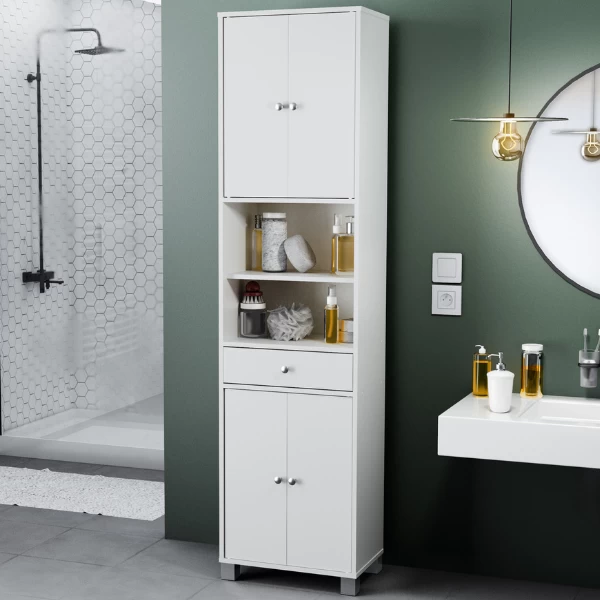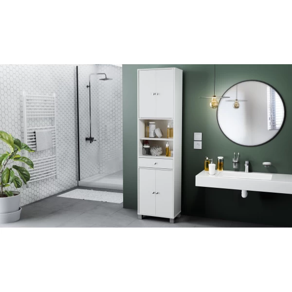 Deze hippe kolomkast past door zijn neutrale witte kleur in bijna elke badkamer. De leuke deurknopjes werken het geheel af. Deze ruime kast is ideaal voor het opbergen van uw handdoeken en washandjes, in de open vakken is er plaats voor nog wat verzorgingsproducten. In de lade kunnen eventueel nog wat make-up artikelen opgeborgen worden. Een opgeruimde badkamer verzekerd met kolomkast Spa! Schroeven en pluggen voor wandmontage niet inbegrepen.