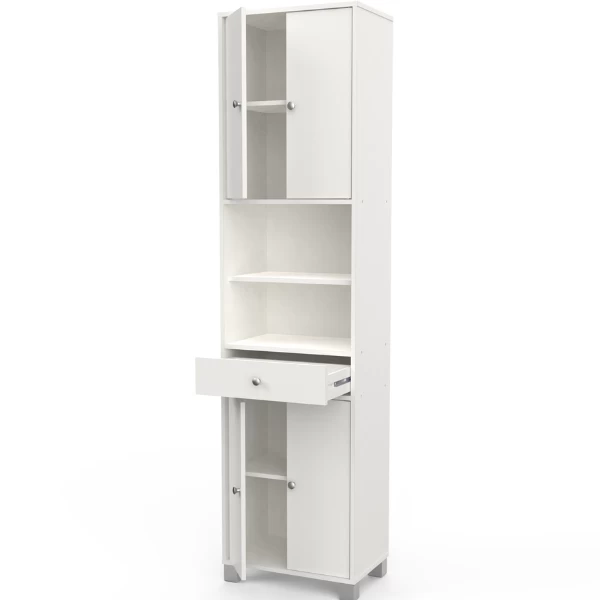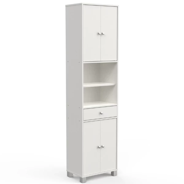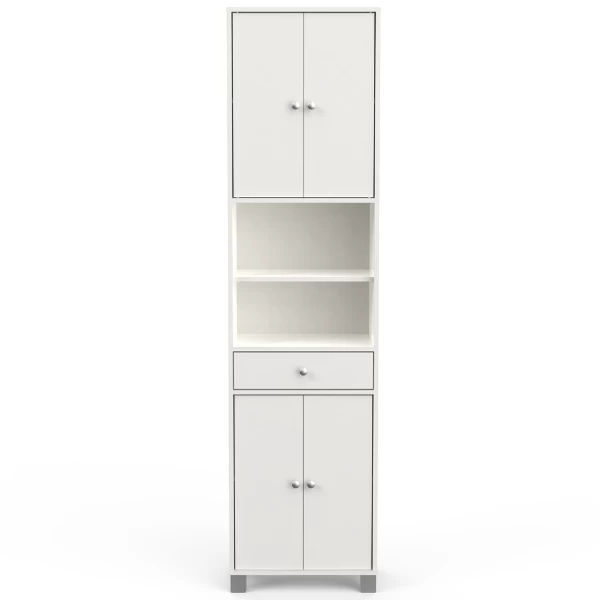 Kolomkast Spa is gemaakt uit gemelamineerde spaanplaat in mat wit en bestaat uit 4 draaideuren, 2 legplanken en 2 open vakken.