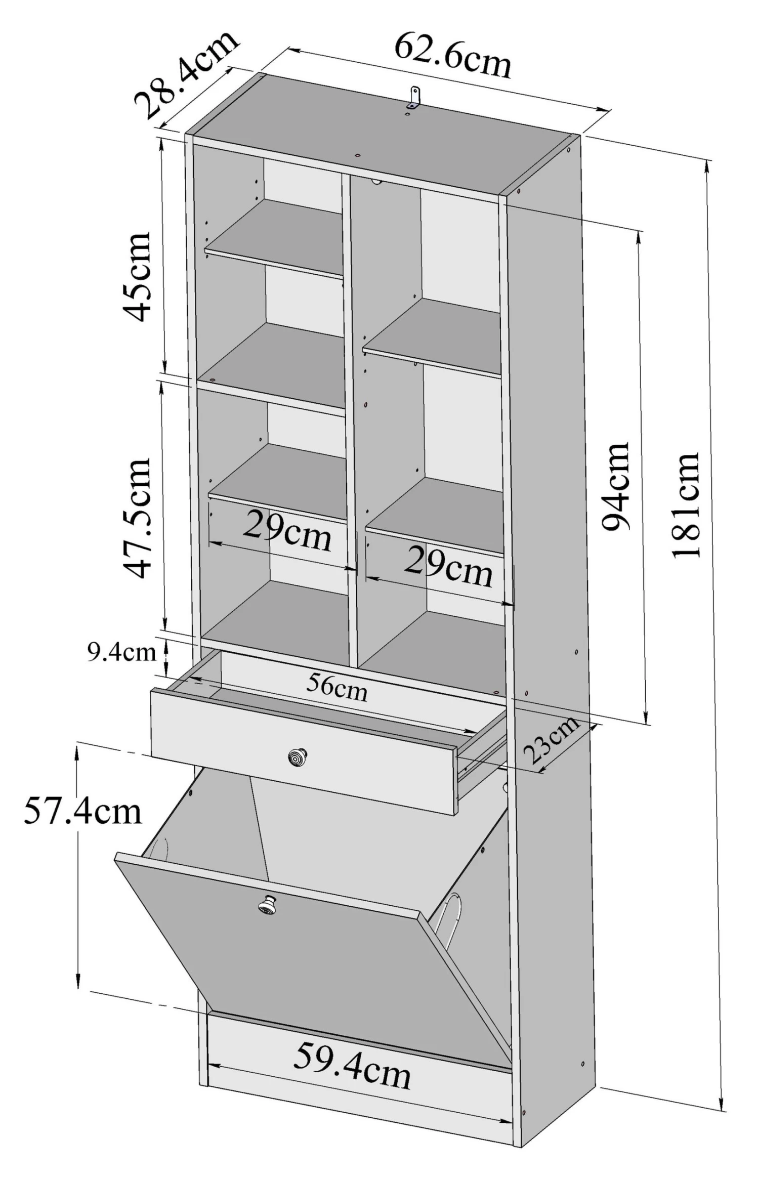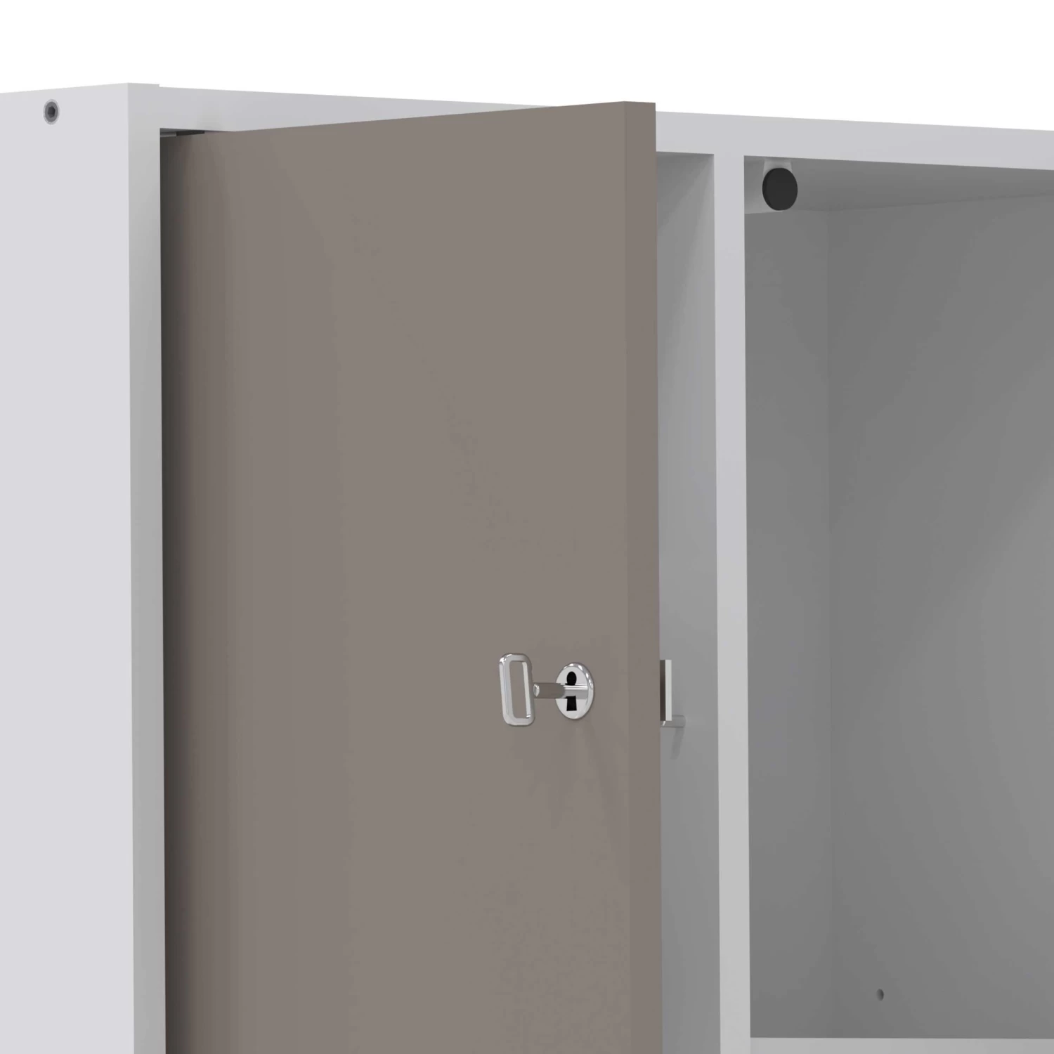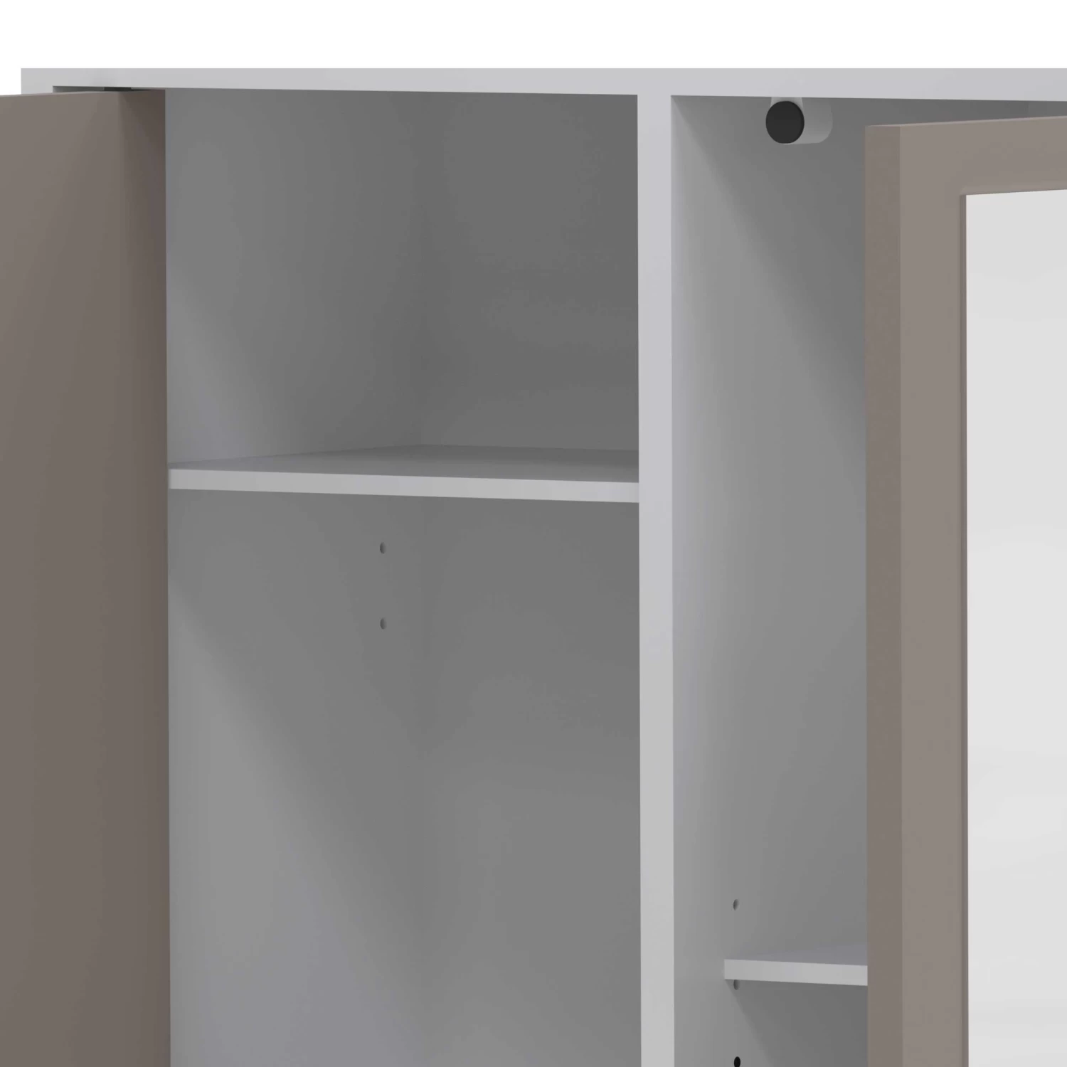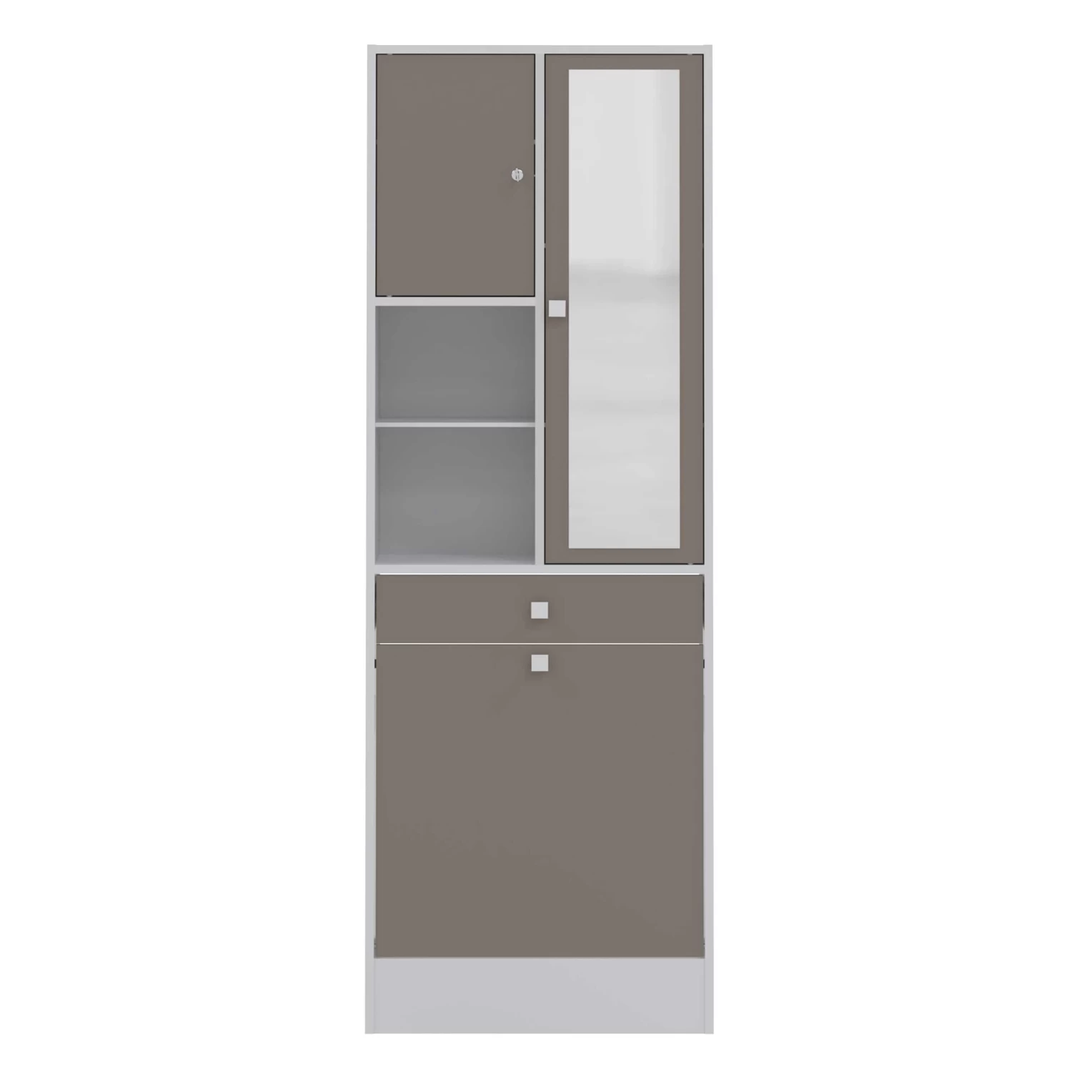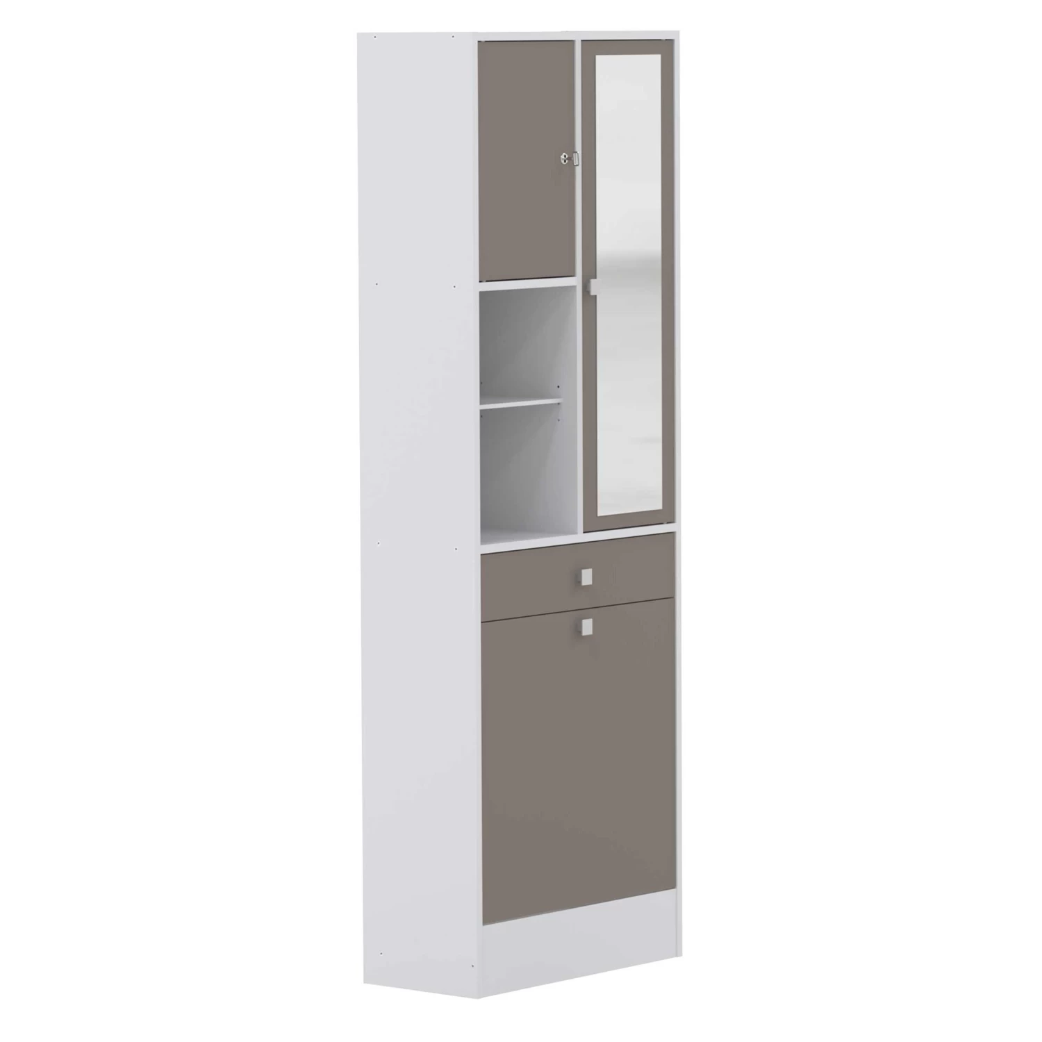 Kolomkast Variety beschikt in totaal over 3 deuren met verschillende afmetingen, waarvan 1 met spiegel, 5 legplankjes, 1 lade en een wasmand. De lade en deuren zijn afgewerkt in taupe.