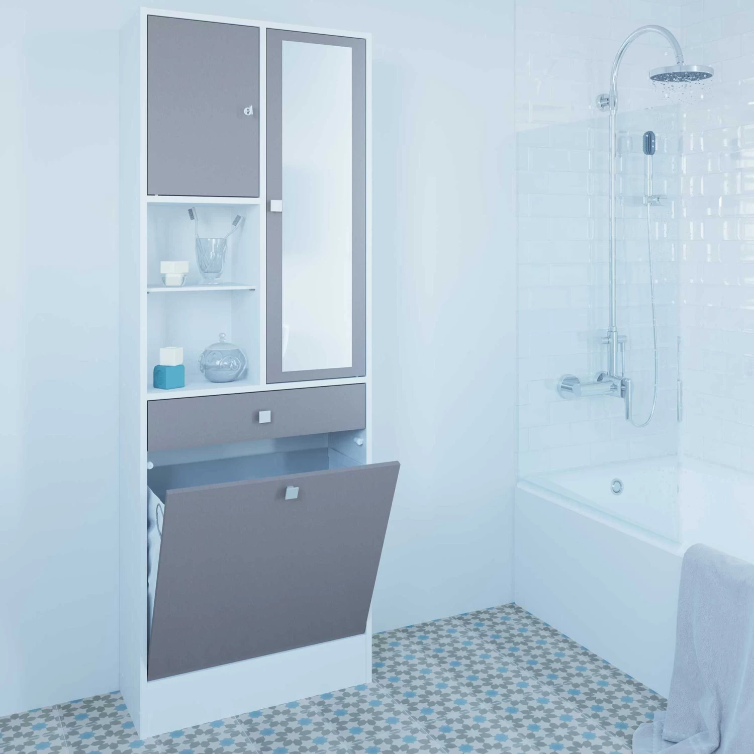 Kolomkast Variety is de perfecte opbergoplossing in elke badkamer. Deze multifunctionele kast biedt je niet alleen plaats om handdoeken, douchegerief en verzorgingsproducten op te bergen. Onderaan beschik je ook over een wasmand, die netjes verborgen zit achter een deur.