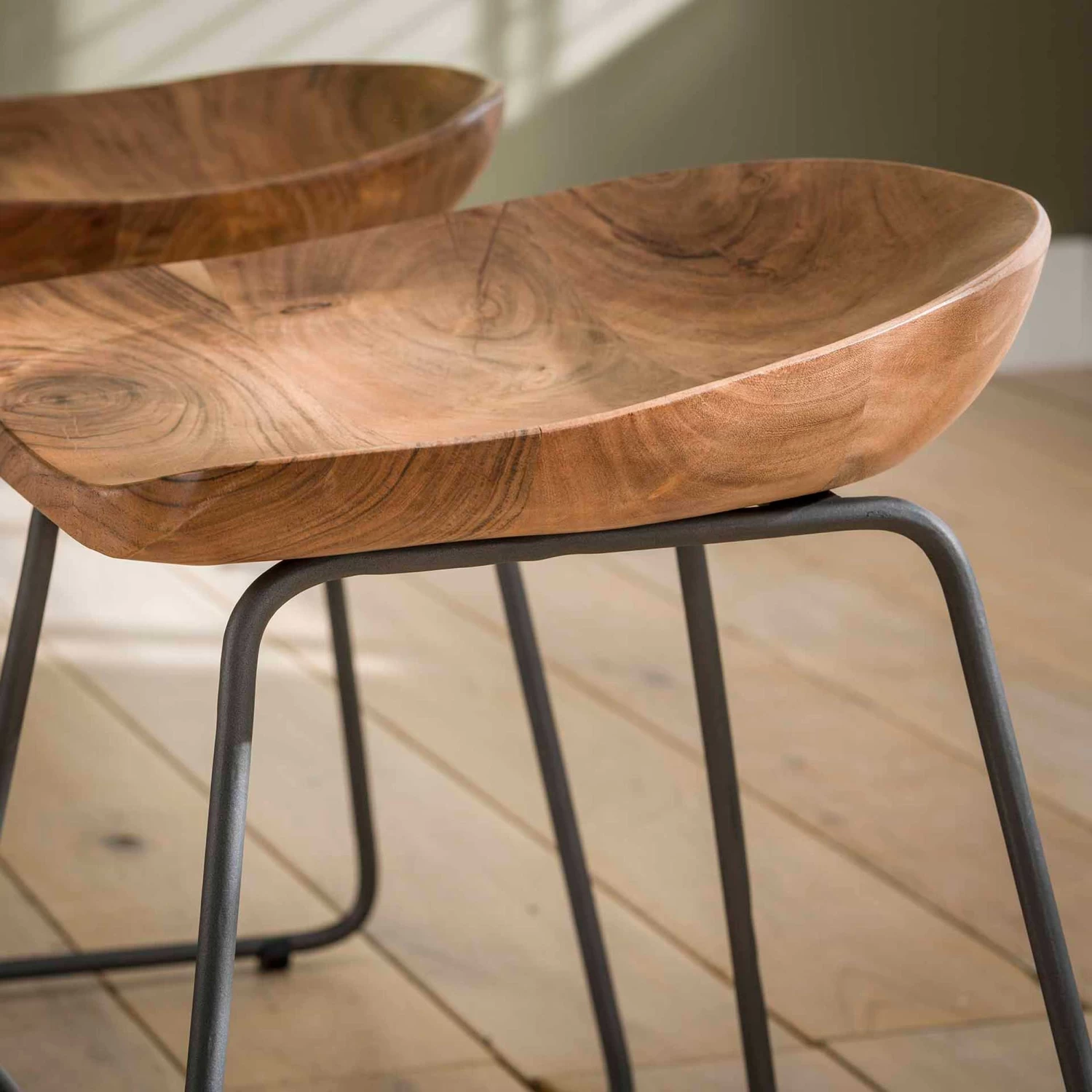 Laag krukje met een comfortabele zitting uit natuurlijk massief acaciahout en een gepoedercoat metalen onderstel. Plaats de leuke krukjes aan een zijde van je tafel om een speels effect te creëren. De afgebeelde prijs is de prijs per stoel. De stoel wordt enkel per twee stuks verkocht.