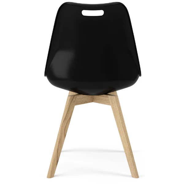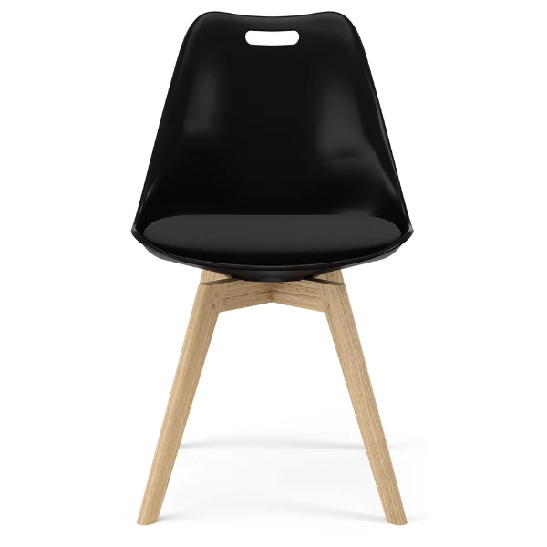 Eetkamerstoel Blair heeft een zwarte kuip gemaakt uit polypropyleen en een zwart zitkussen. Met handgreep.