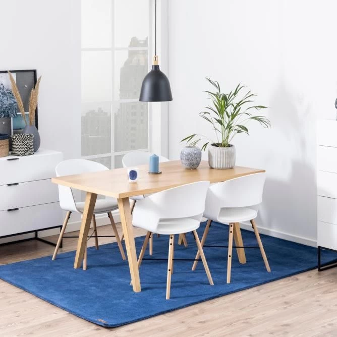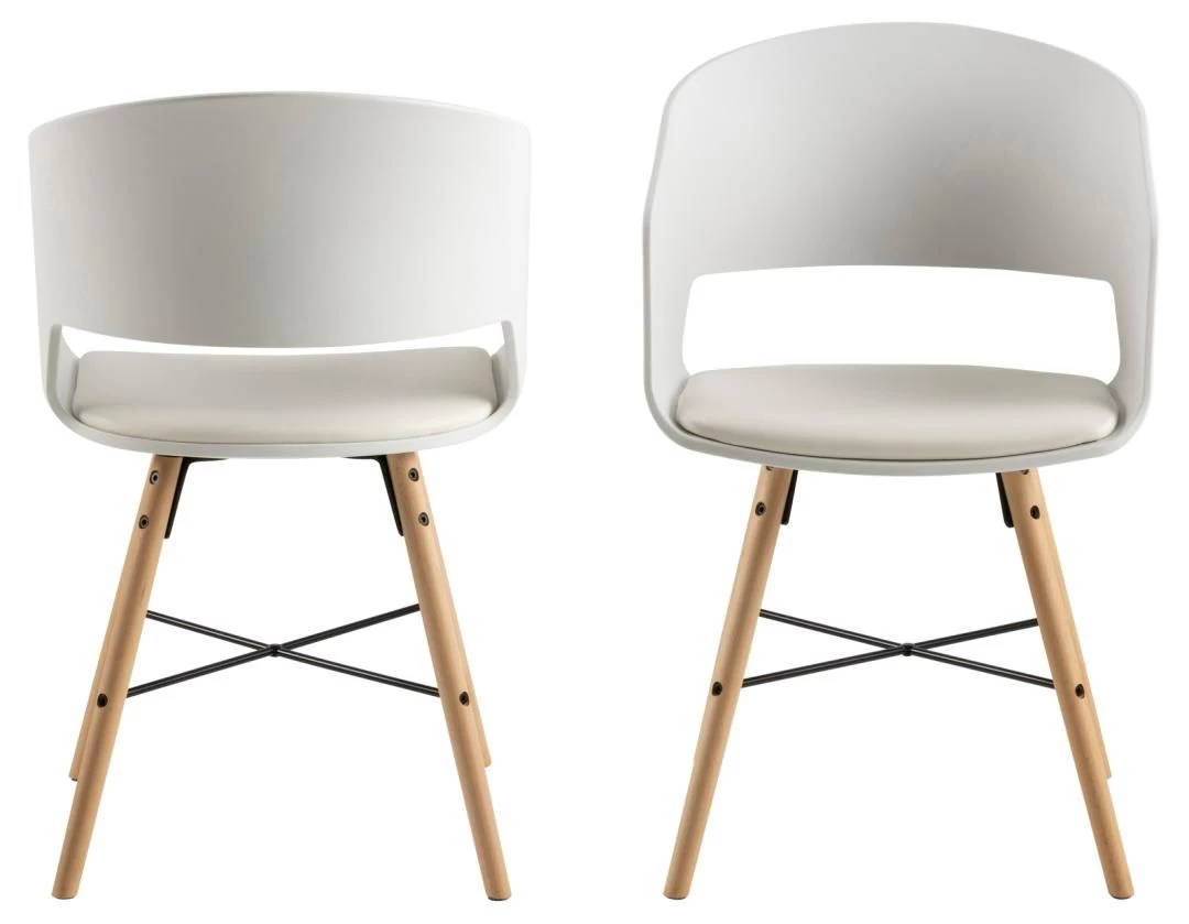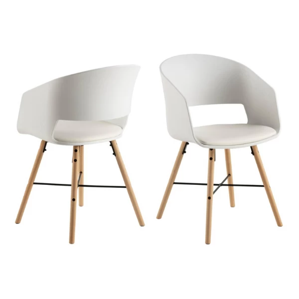 Niets ademt meer modern dan een kuipstoel. Deze eetkamerstoel biedt het beste van twee werelden – een stevige rugleuning, armleuningen en een zacht gestoffeerde zitting om echt comfortabel te tafelen. Let ook op de open rugleuning die een extra dimensie aan het ontwerp geeft. Ook de gekruiste draden verhogen het visuele aspect van de stoel, terwijl deze toch stevig staat. De stoel is samengesteld uit wit PU en PP, met benen uit massief beukenhout.