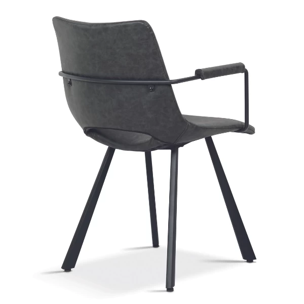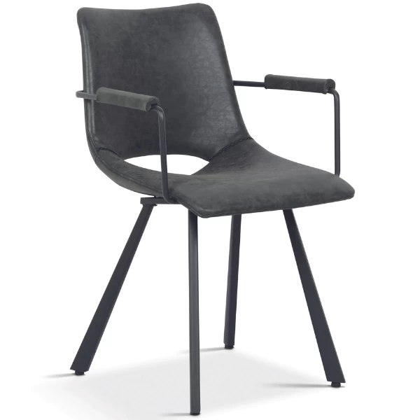 Kuipstoel Sissi heeft een stoere, industriële look door zijn bekleding in PU-leder en zijn zwarte metalen poten. Het gat in de zitting geeft de stoel een speels karakter. De armleuning zorgt voor extra zitcomfort. Ook verkrijgbaar in andere kleuren.