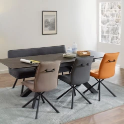 Ben je nog op zoek naar stoelen om je eetkamer te vervolledigen? Bekijk dan zeker de stoelen Rabia. De stoel bestaat uit zwarte metalen poten en is bekleed met antracietkleurige stof. De stoelen geven een klassevolle retro-uitstraling aan je interieur. Dankzij de kuipvorm en de armleuningen geniet je van optimaal zitcomfort. De stoel is ook verkrijgbaar met bekleding in mosgroene stof of cognackleurig kunstleer.