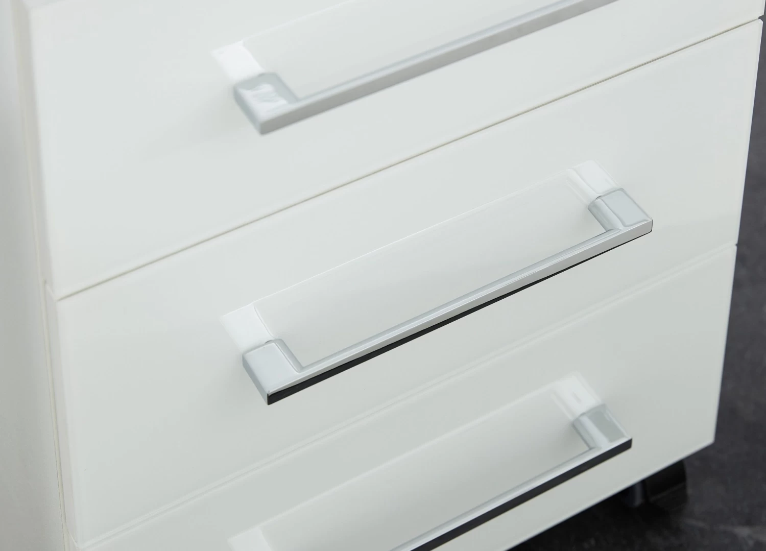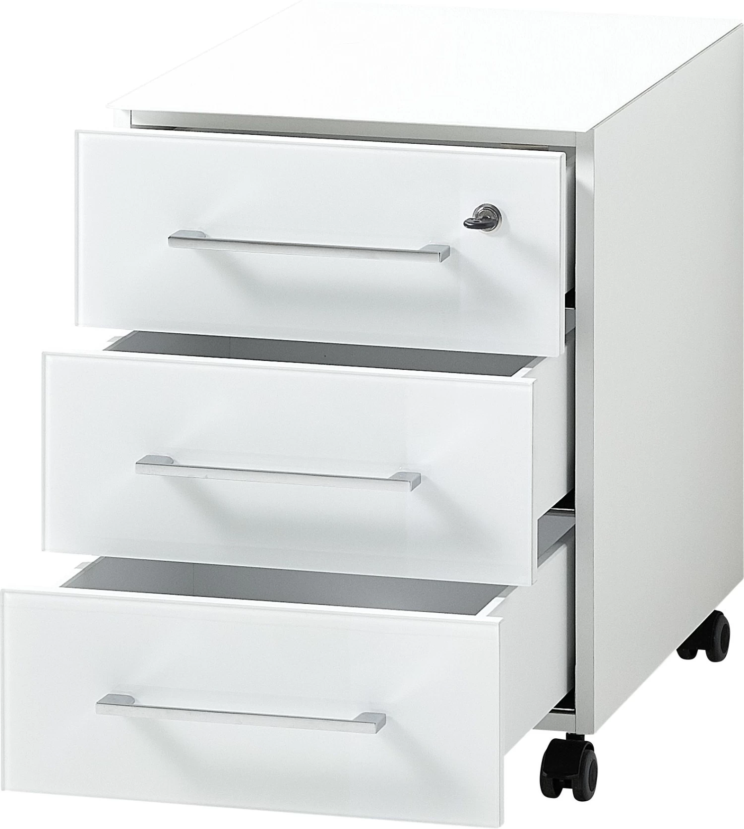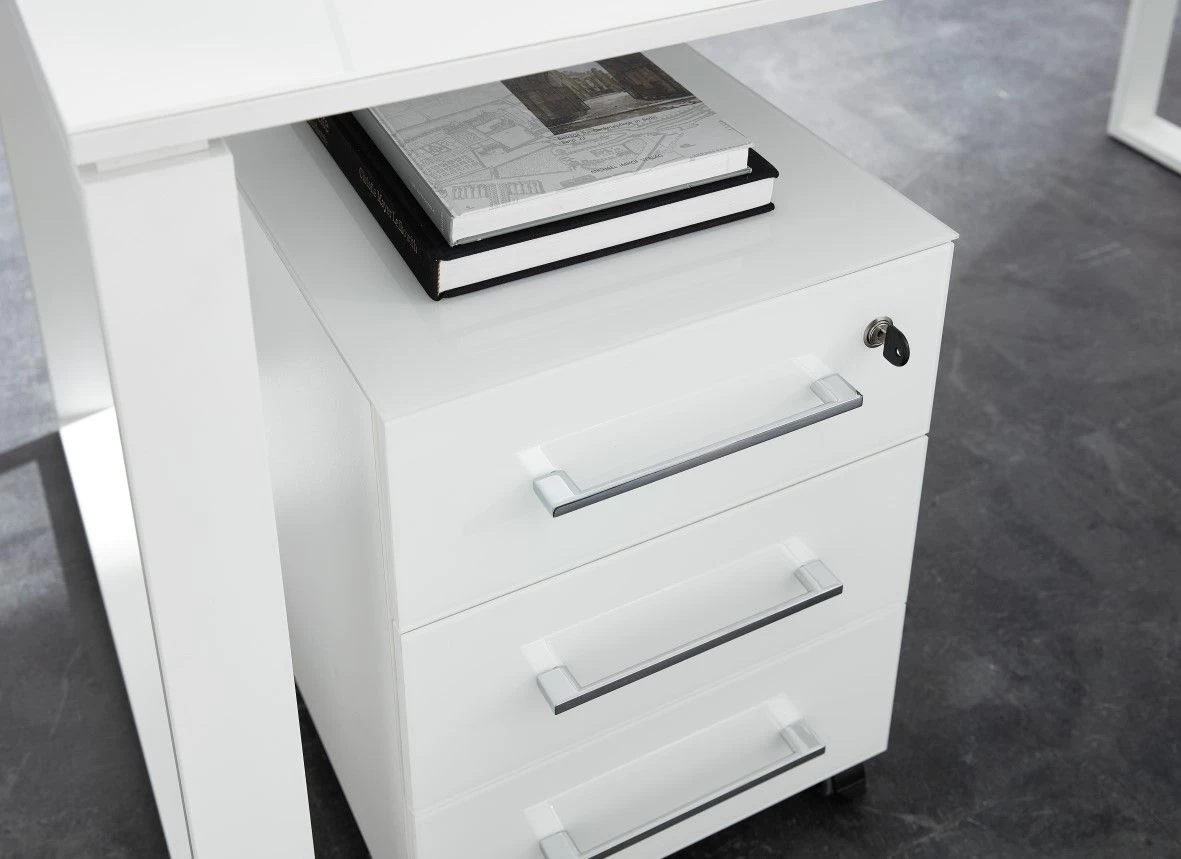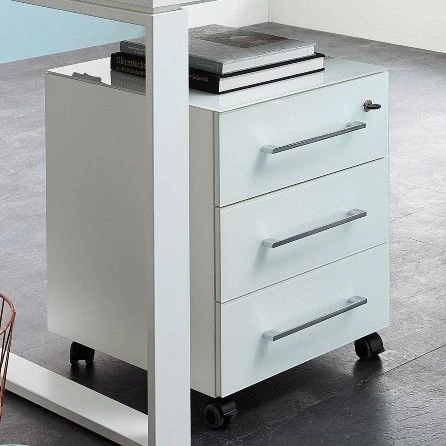 Deze ladeblok telt 3 lades waarvan je de bovenste ook op slot kan doen. Het bovenblad en de fronten van de lades zijn afgewerkt met wit veiligheidsglas. Dankzij de 4 wieltjes plaats je ladeblok Mouna overal waar je ‘m nodig hebt.