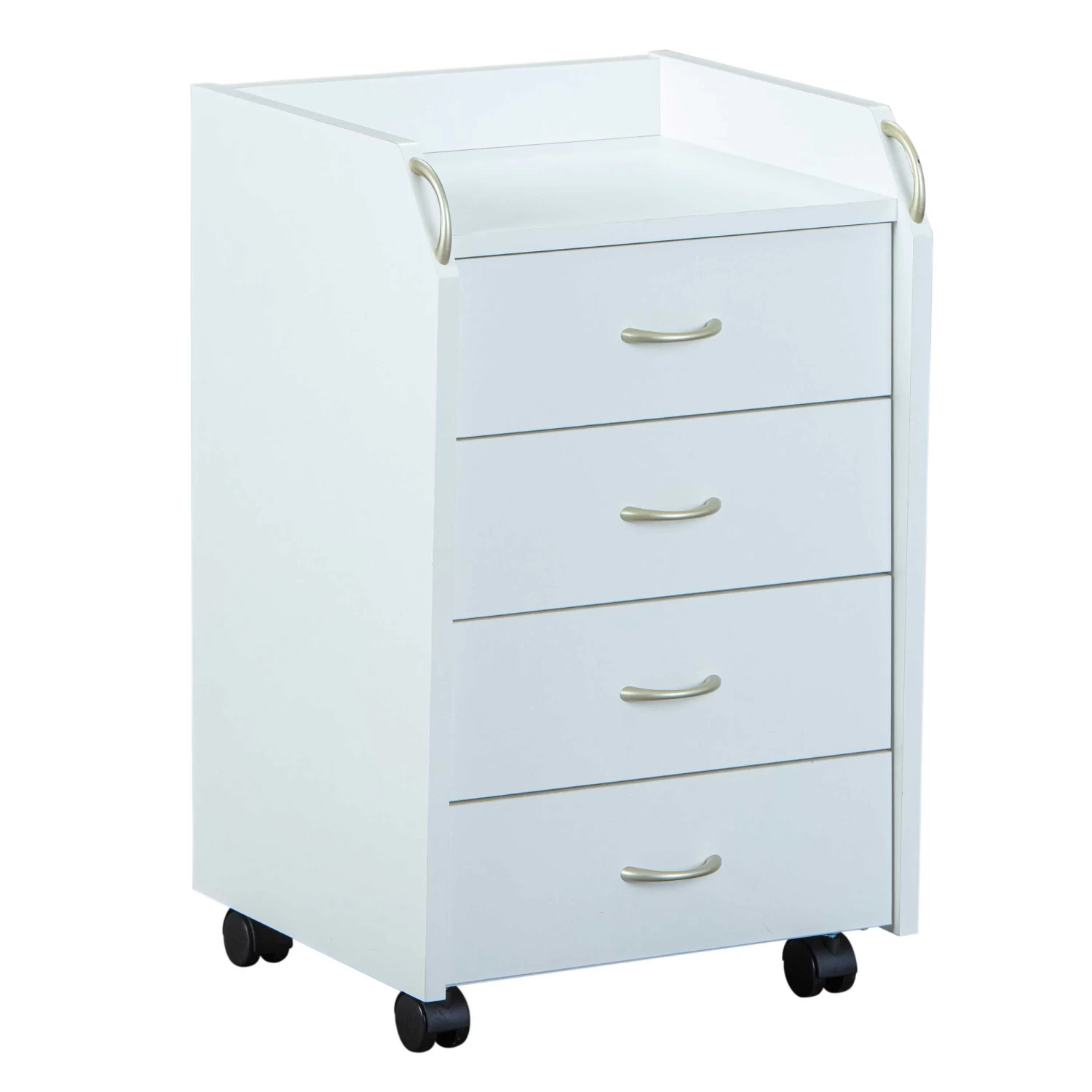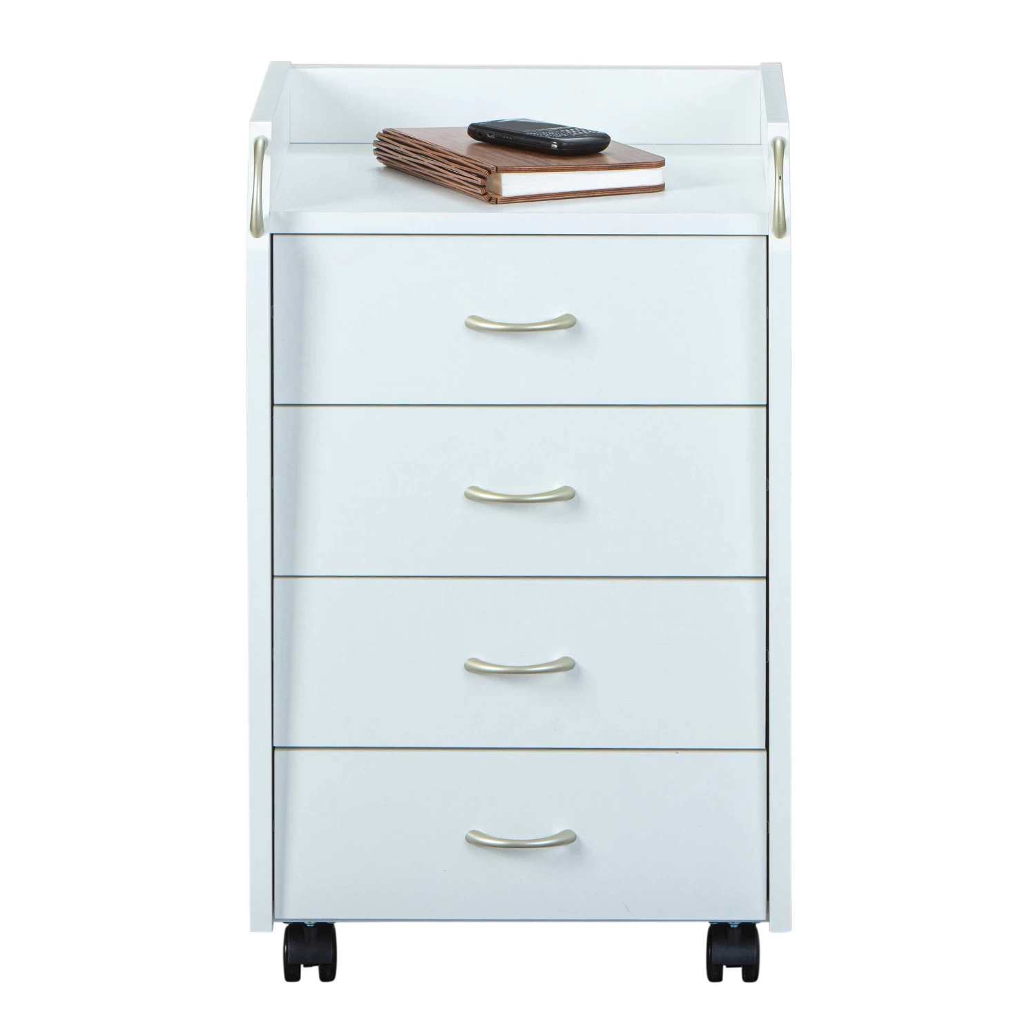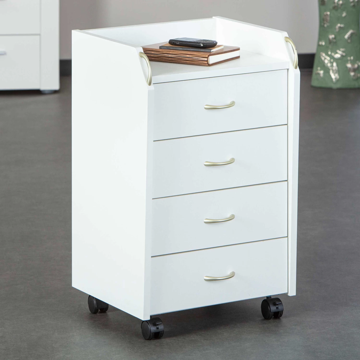 Ladeblok Podence op wieltjes in wit met 4 lades, met handgrepen in grijs aluminium.