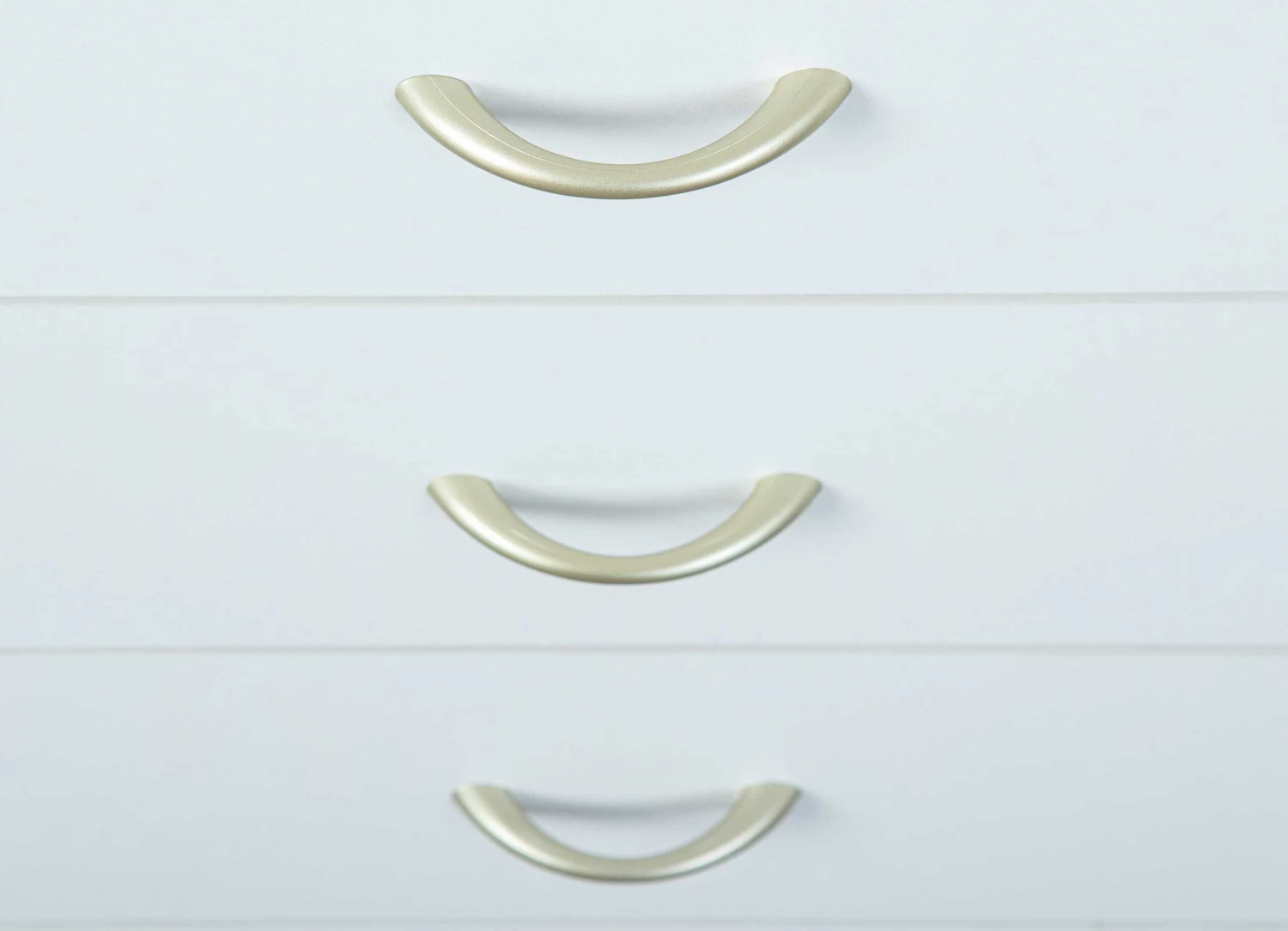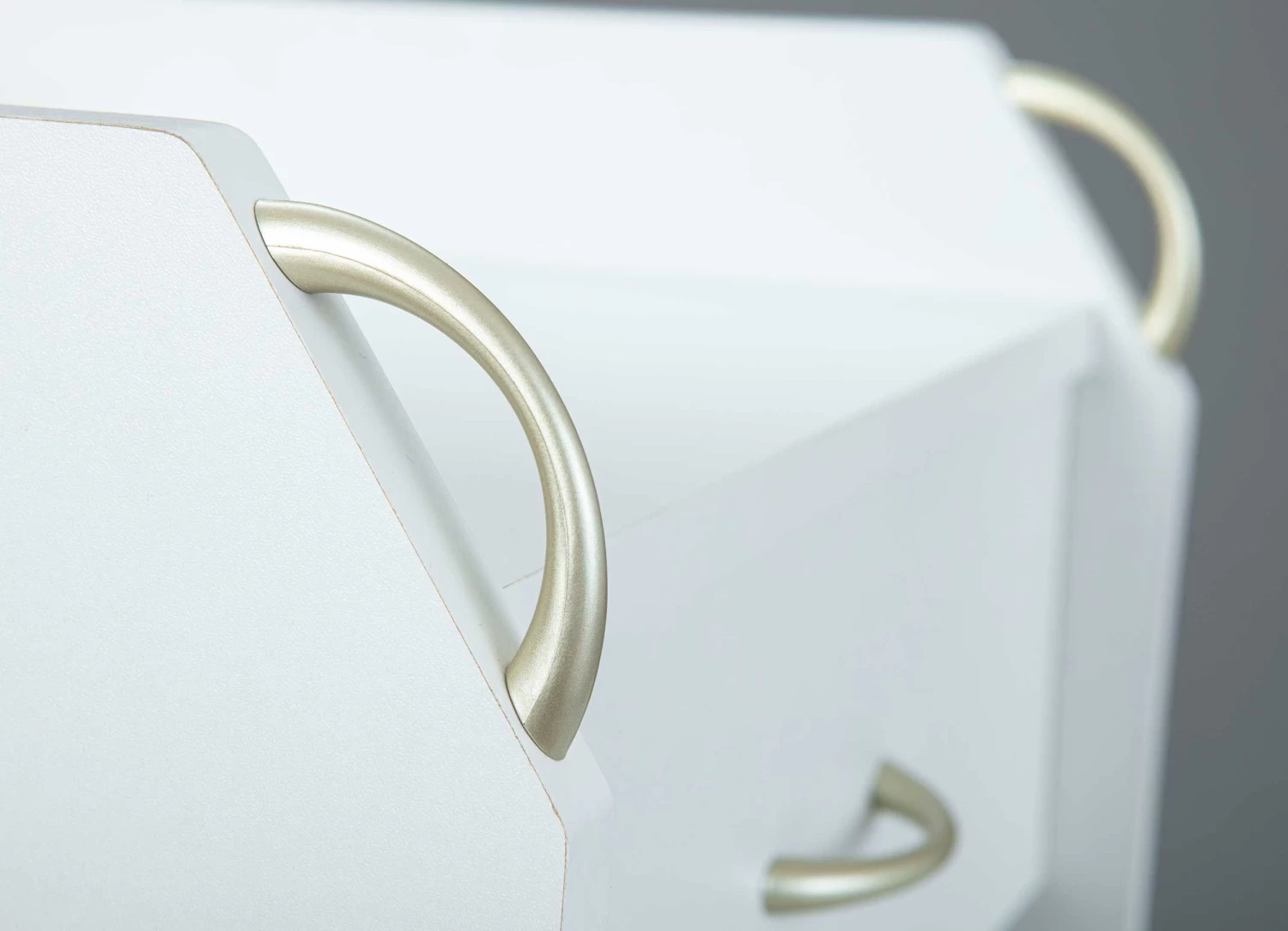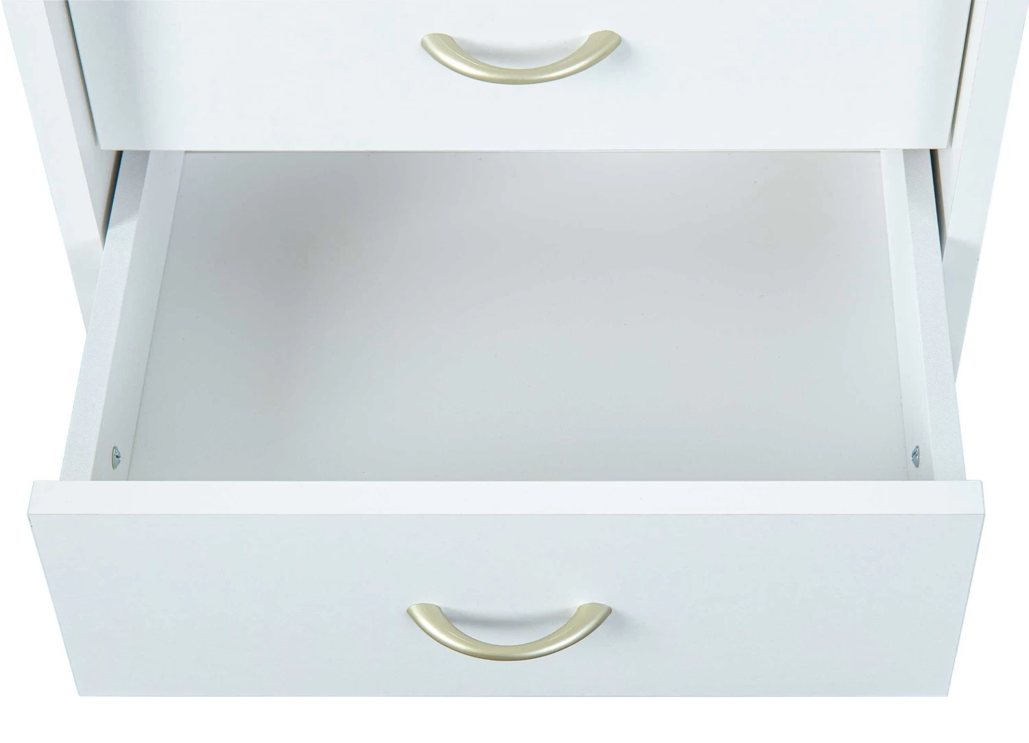 Ladeblok Podence op wieltjes in wit met 4 lades, met handgrepen in grijs aluminium.