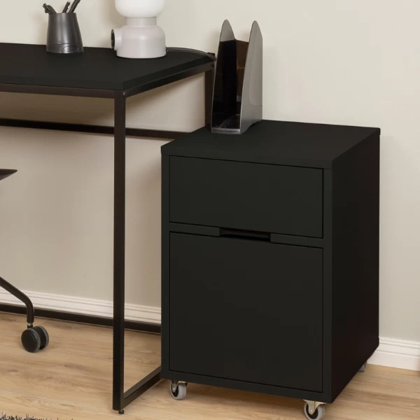 Ladeblok Trend heeft door zijn rechte lijnen en uitgesneden handgrepen een strakke en moderne stijl. Het meubel past perfect binnen een minimalistisch interieur waar stijl en functie op de voorgrond treden zonder te veel poespas. De zwarte kleur straalt klasse uit. De kast heeft 1 lade en 1 draaideur die een soft close-systeem hebben waardoor deze geruisloos gesloten kunnen worden. De lade heeft een stijlvolle linnenlook aan de zijkant. Achter de draaideur bevindt zich nog een legplank. Het kastje heeft 4 wielen onderaan zodat deze gemakkelijk verplaatst kan worden. Het Ladeblokje is perfect te combineren met bureau Trend en biedt extra bergruimte. Bekijk ook de andere meubels van de trend collectie op onze website.