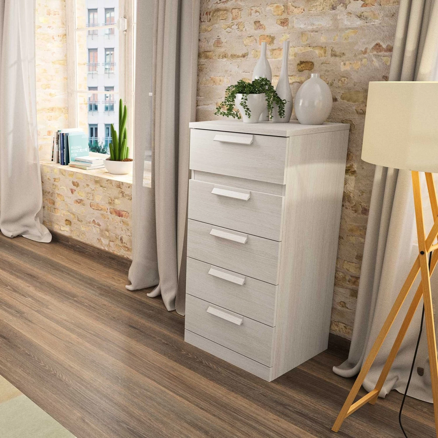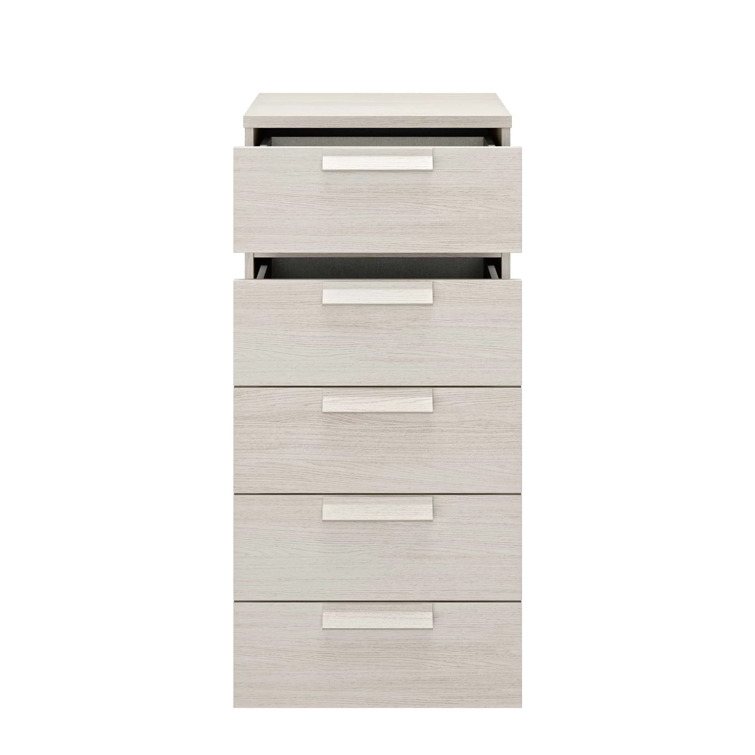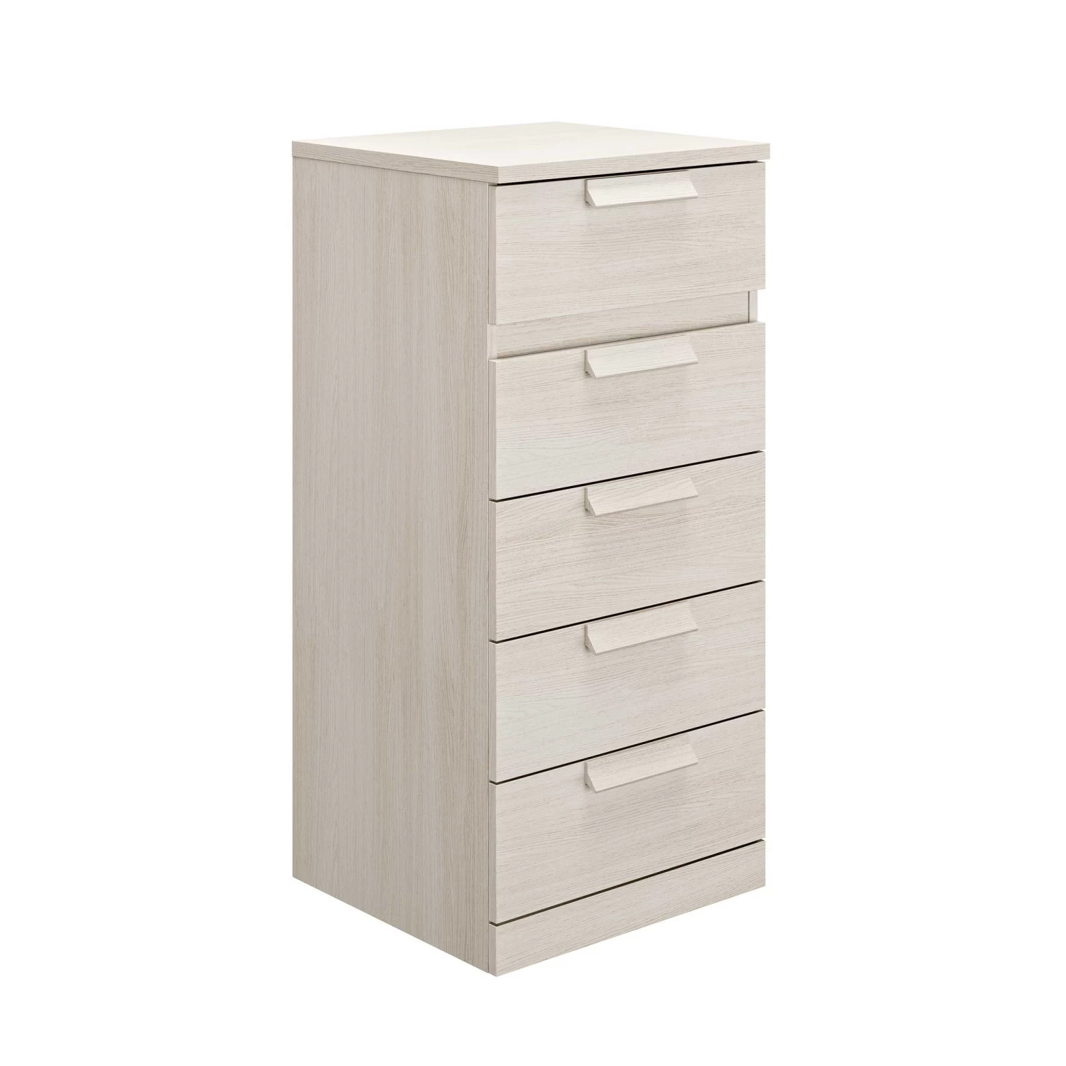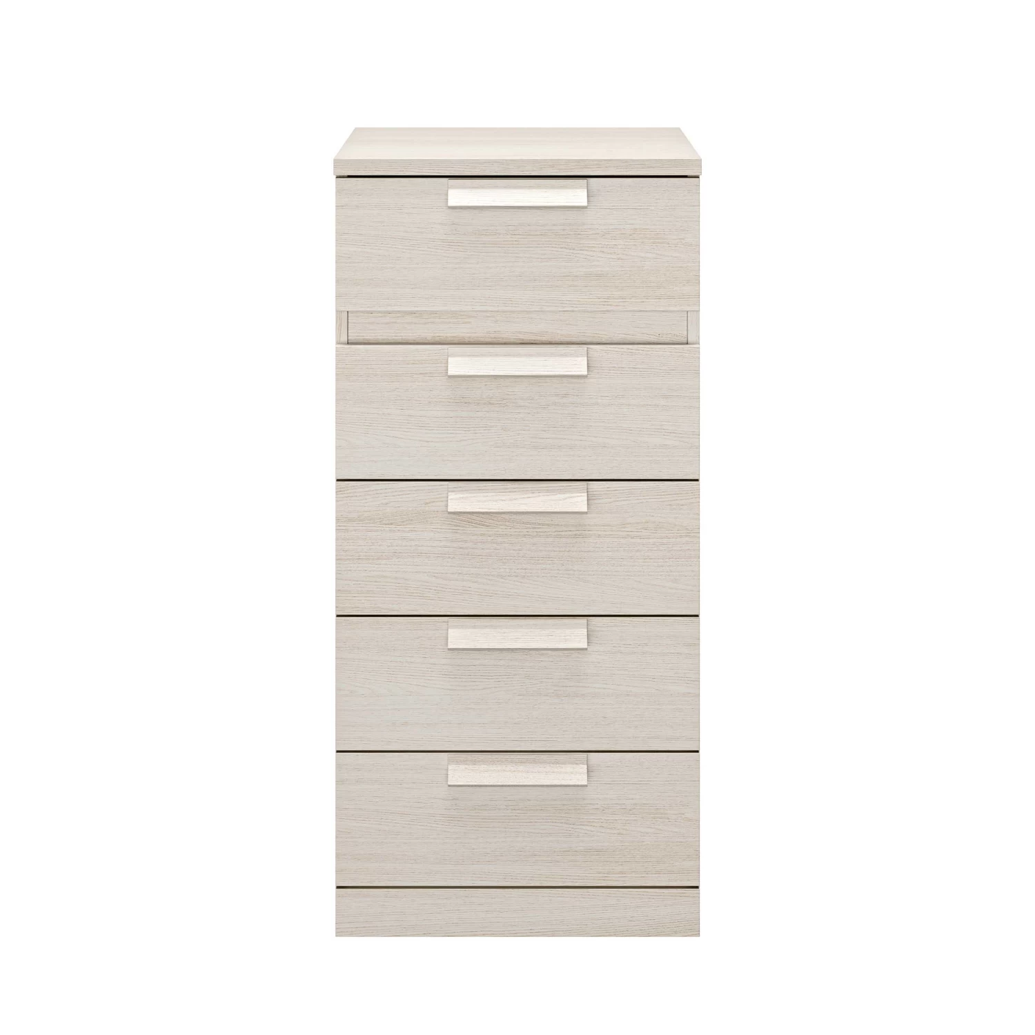 In de 5 lades van deze smalle kast kun je heel wat spullen kwijt. De kast is afgewerkt in gebleekte es.