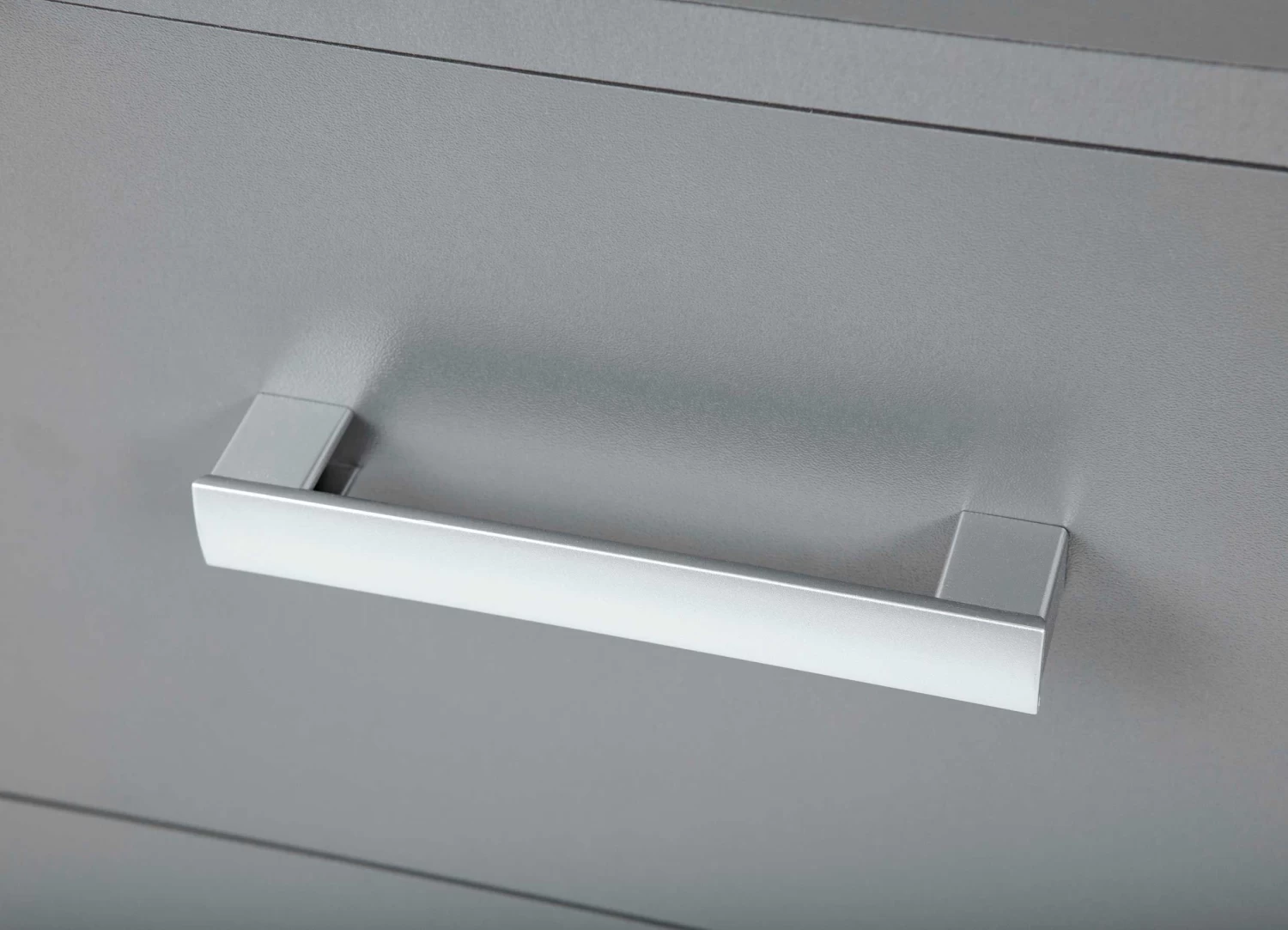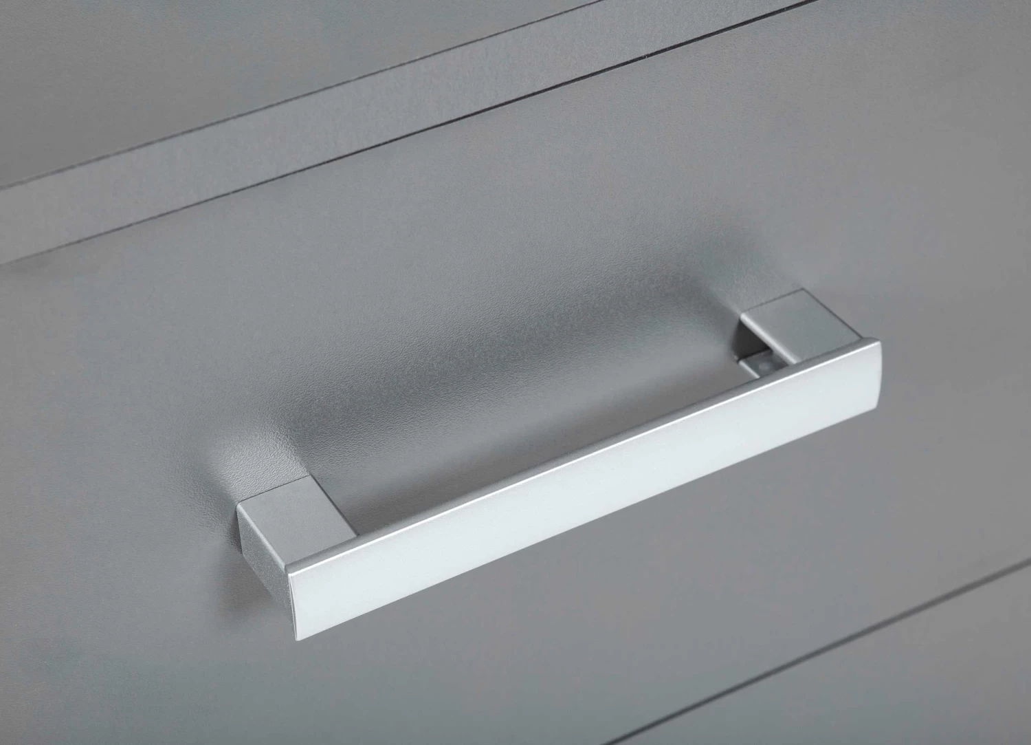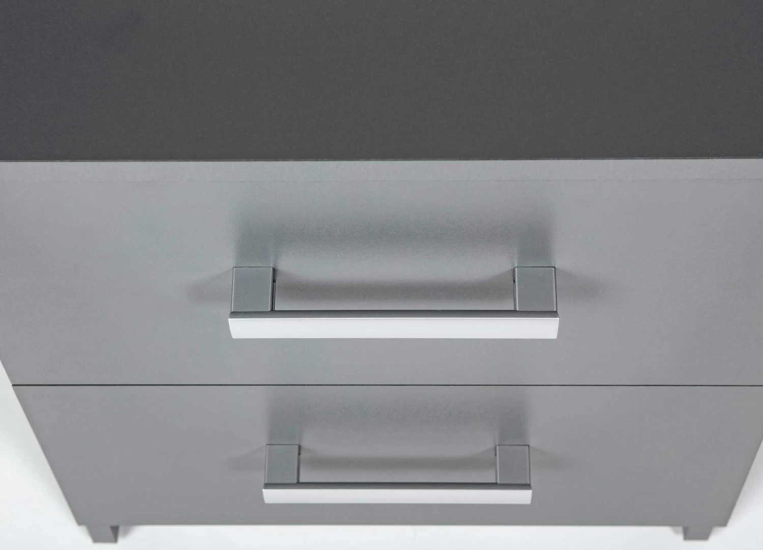 De kantoormeubelen van de Eden-collectie zijn gemaakt uit spaanplaat. Deze moderne meubelen stralen ook enige rust uit dankzij de simpele afwerking in effen grafiet grijs.Â