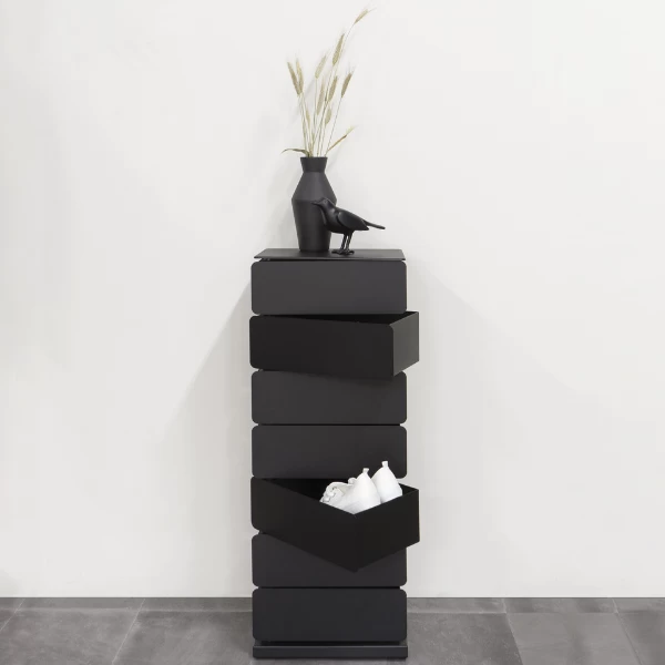 Het unieke design zal van deze ladekast een echte eyecatcher maken in uw interieur. De 7 uitklapbare lades bieden plaats aan uw kantoorspullen, toiletspullen of waarom deze kast niet als schoenenkast (voor schoenen tot maat 42) gebruiken? De kast biedt plaats aan een 7-tal paar schoenen.Â