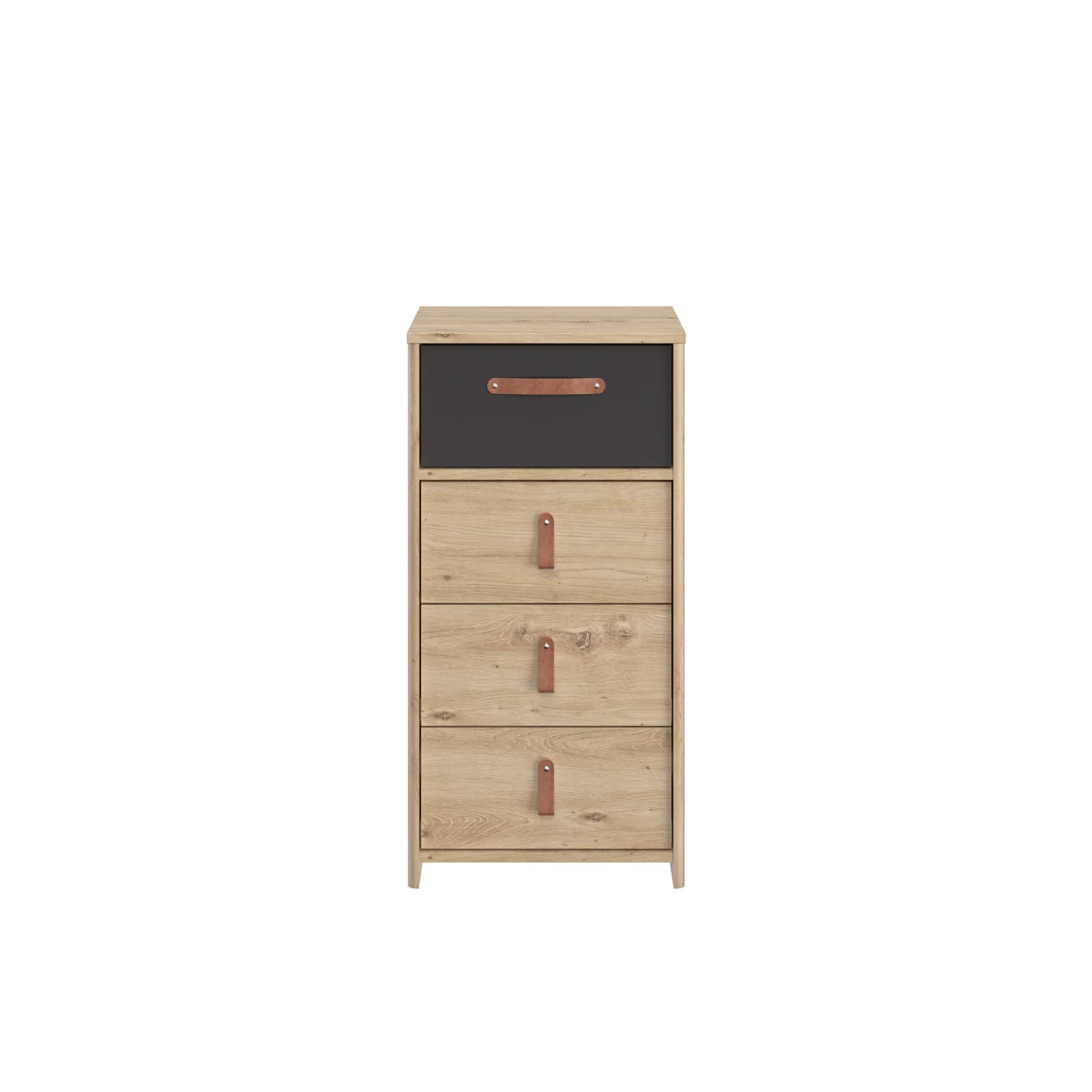 Ladekast Liam in artisan eik/zwart met 4 lades en bruine handgrepen.