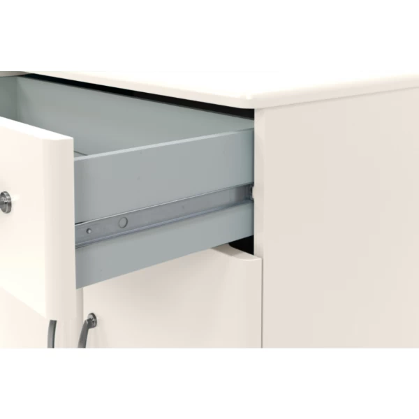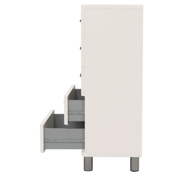 Deze ladekast is uitgerust met 5 lades. De boven- en onderkant van deze kast zijn gemaakt uit witgelakt MDF, de zijkanten zijn gemaakt uit spaanplaat en zijn afgewerkt met een wit melaminelaagje.
