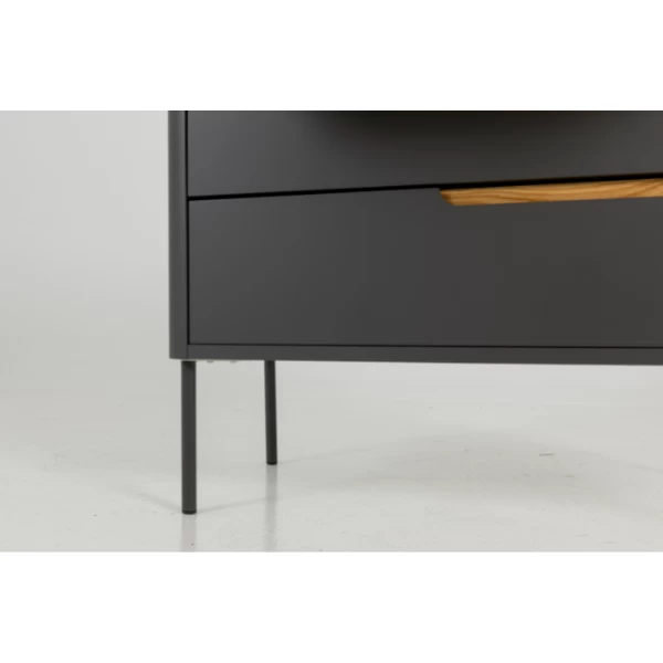 Deze moderne ladekast is uitgerust met 4 lades. Ze biedt veel opslagruimte en is daarom uitermate geschikt voor in de hal, de slaapkamer of de inloopkast. Waar kasten er soms log uit kunnen zien, is dat door de afgeronde hoeken en de slanke, metalen poten bij deze kast niet het geval. Een ander voordeel van deze kast is dat de lades met een softclose-systeem zijn uitgerust, waardoor je andere mensen in huis niet wakker maakt, wanneer je je kleren pakt. De boven- en onderkant van deze ladekast zijn gemaakt uit spaanplaat, de zijkanten uit MDF en de poten uit metaal. Het geheel is afgewerkt met eikenhouten details.