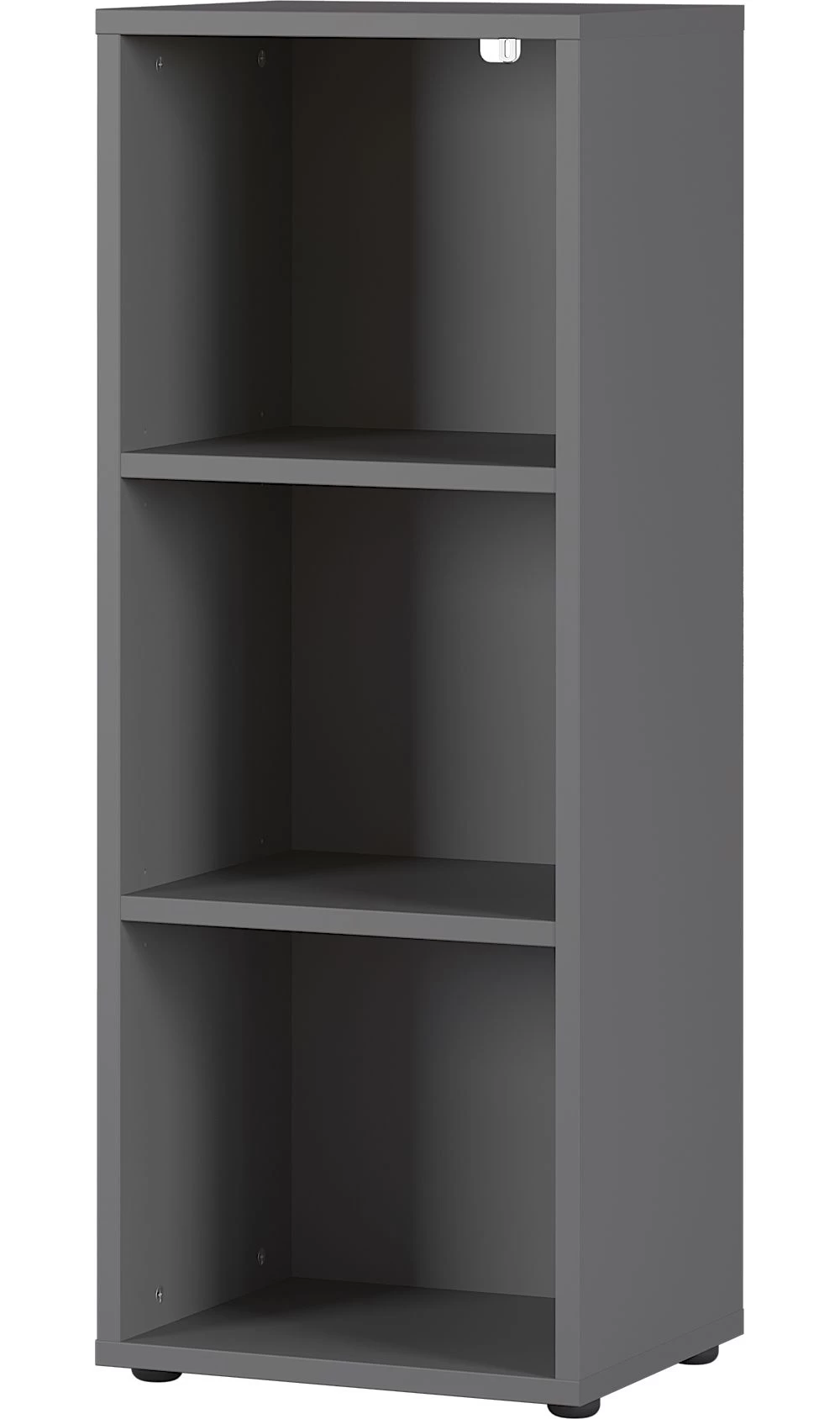 Deze smalle, lage boekenkast in grafietgrijs van de Osmond-collectie telt 3 open vakken. De 2 legplanken zijn elk verstelbaar in de hoogte. Installeer deze boekenkast in jouw kantoor, in de woonkamer of zelfs in de kinderkamer en berg er al jouw boeken en documenten netjes in op.