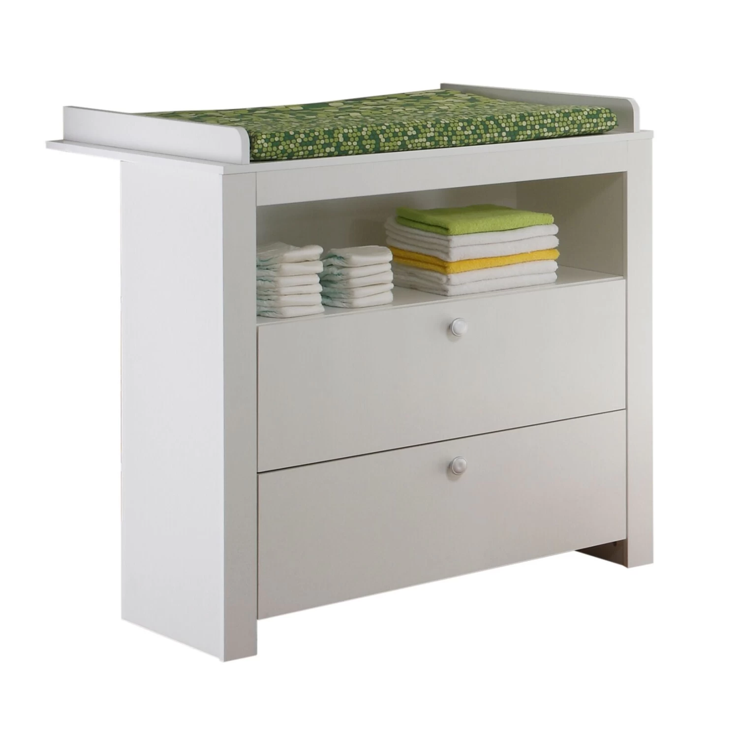 Verfraai je kinderkamer met de Olivia-luiertafel in wit en geniet van stijl en functionaliteit in één elegant meubel.