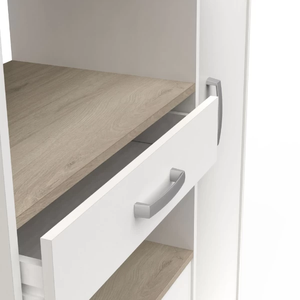 Deze veelzijdige microgolfkast zal gemakkelijk een plekje vinden in bijna elke keuken dankzij zijn neutraal kleurenpalet van mat wit en Kronberg eikdecor. In de lade is plaats voor uw bestek en achter de draaideuren is plaats voor servies, glazen, keukengerei, kookpotten en voorraad. In het bovenste open vak is er plaats voor een microgolfoven of andere keukenapparatuur en in het open vak onder de lade kunt u eventueel wat kruiden en olijfolie plaatsen. Schroeven en pluggen voor wandmontage niet inbegrepen.