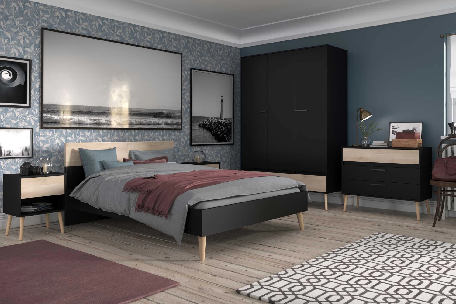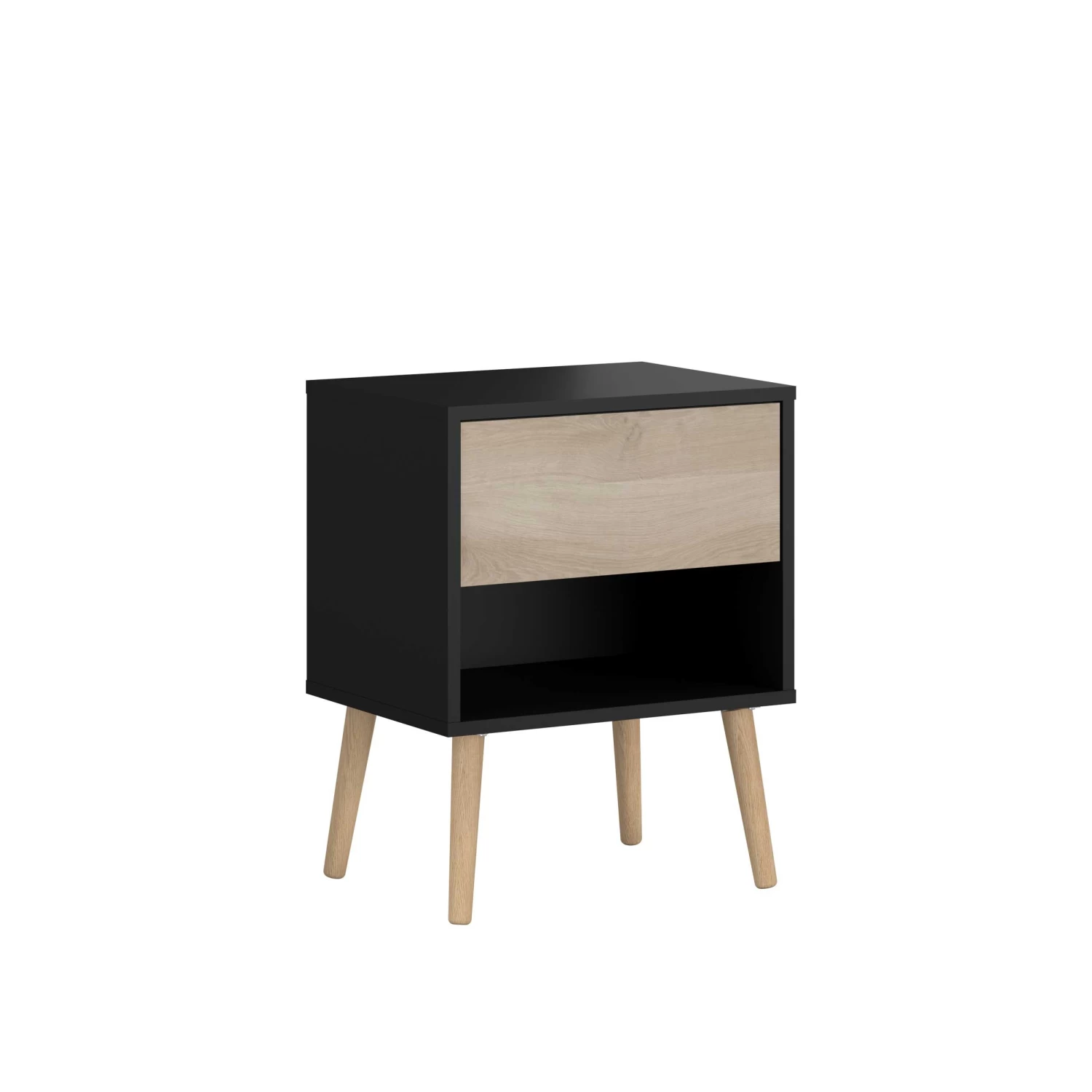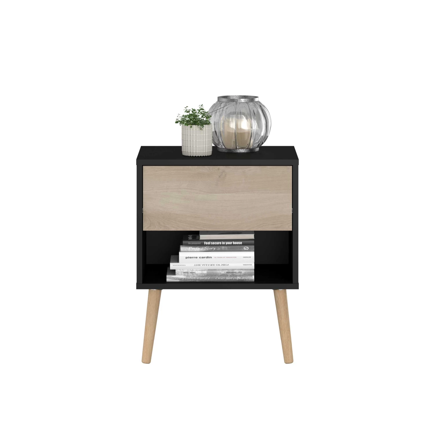 Nachtkastje Hardy brengt de tijdloze Nordische en Scandinavische stijl in de slaapkamer. De geslaagde mix van zwarte spaanplaat en Japanse eik zorgt voor een moderne maar warme sfeer.Â