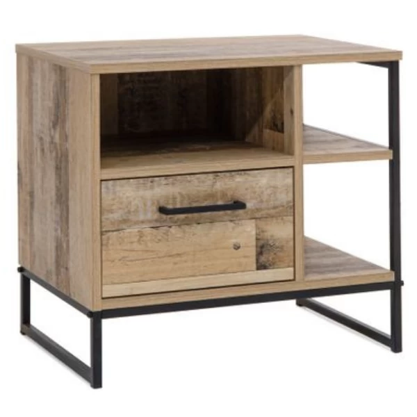 Nachtkastje Kemar met 1 lade en 3 open vakken, gemaakt uit spaanplaat in old style en een kader in zwart metaal.