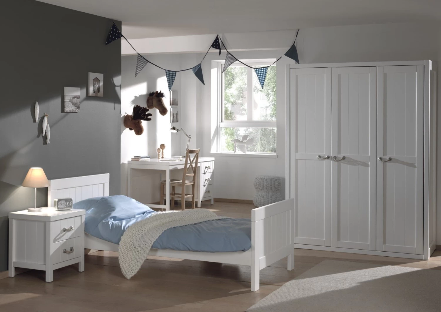 Een praktisch, wit nachtkastje is niet weg te denken in deze slaapkamer.