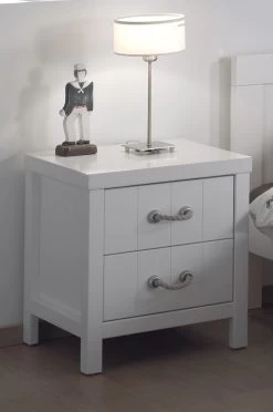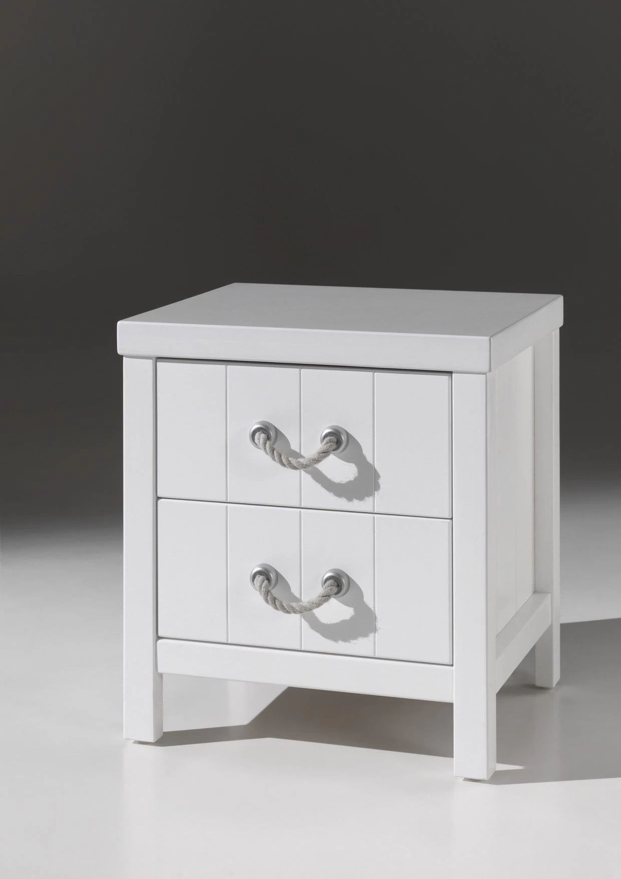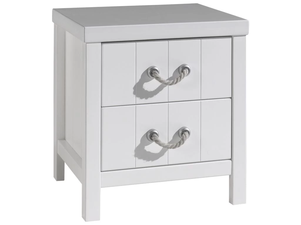 Dit nachtkastje met 2 laden werd gemaakt van wit gelakt MDF en heeft een subtiele afwerking. Denk maar aan de verticale groeven en handgrepen van touw.