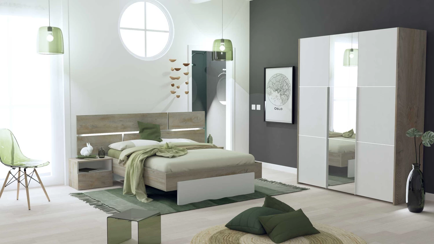 Creëer een moderne omgeving dankzij de meubelen van de Paxton-collectie. Deze meubelen zijn gemaakt uit spaanplaat met een gelakte afwerking in hoogglans wit en grijze eikdecor. De lichte kleuren bezorgen een rustige sfeer in de kamer.