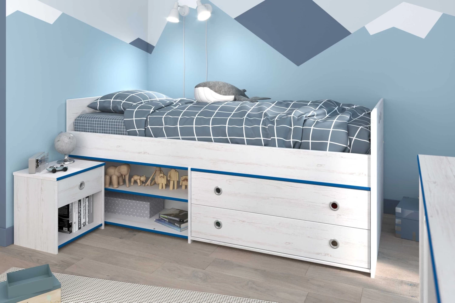 De Smoozy kinderkamer omvat meubelen uit spaanplaat met een wit dendecor. Dankzij de verwisselbare randen van de meubelen kan deze slaapkamer in een-twee-drie tot een jongens- of meisjeskamer omgetoverd worden. De ene kant is namelijk blauw, de andere kant is roze. Je kan tijdens de installatie zelf kiezen welke kleur je wenst te zien.Â