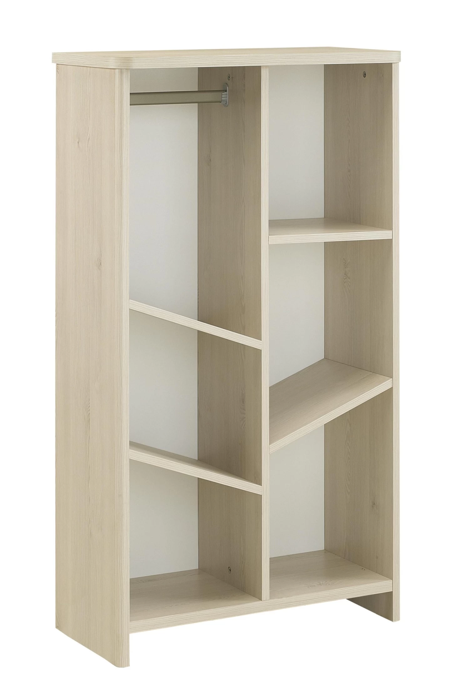 Opbergkast Binno met 4 legplanken en 1 kledingroede. Gemaakt uit spaanplaat met decor van gebleekte den en in het wit.