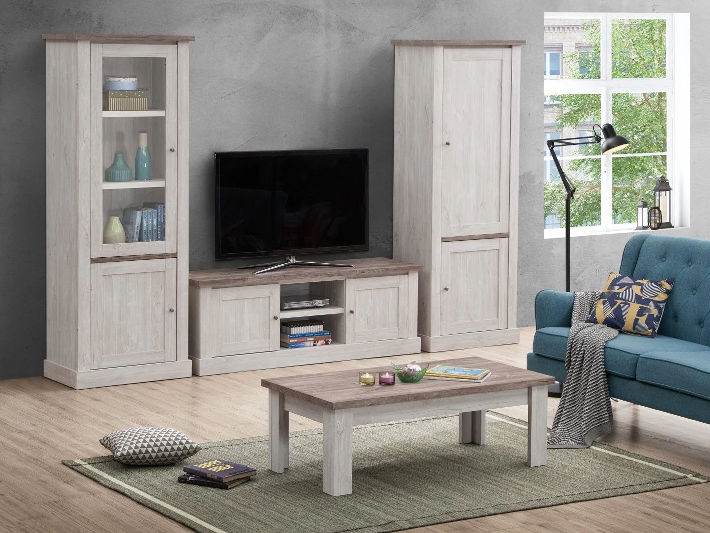 De Elayza meubelen zijn geïnspireerd door de landelijke stijl. Ze zijn gemaakt uit spaanplaat met een decor in witte eik. Deze meubelen beschikken ook over details in grijze eik decor, om enige contrast aan te brengen aan de meubelen.Â