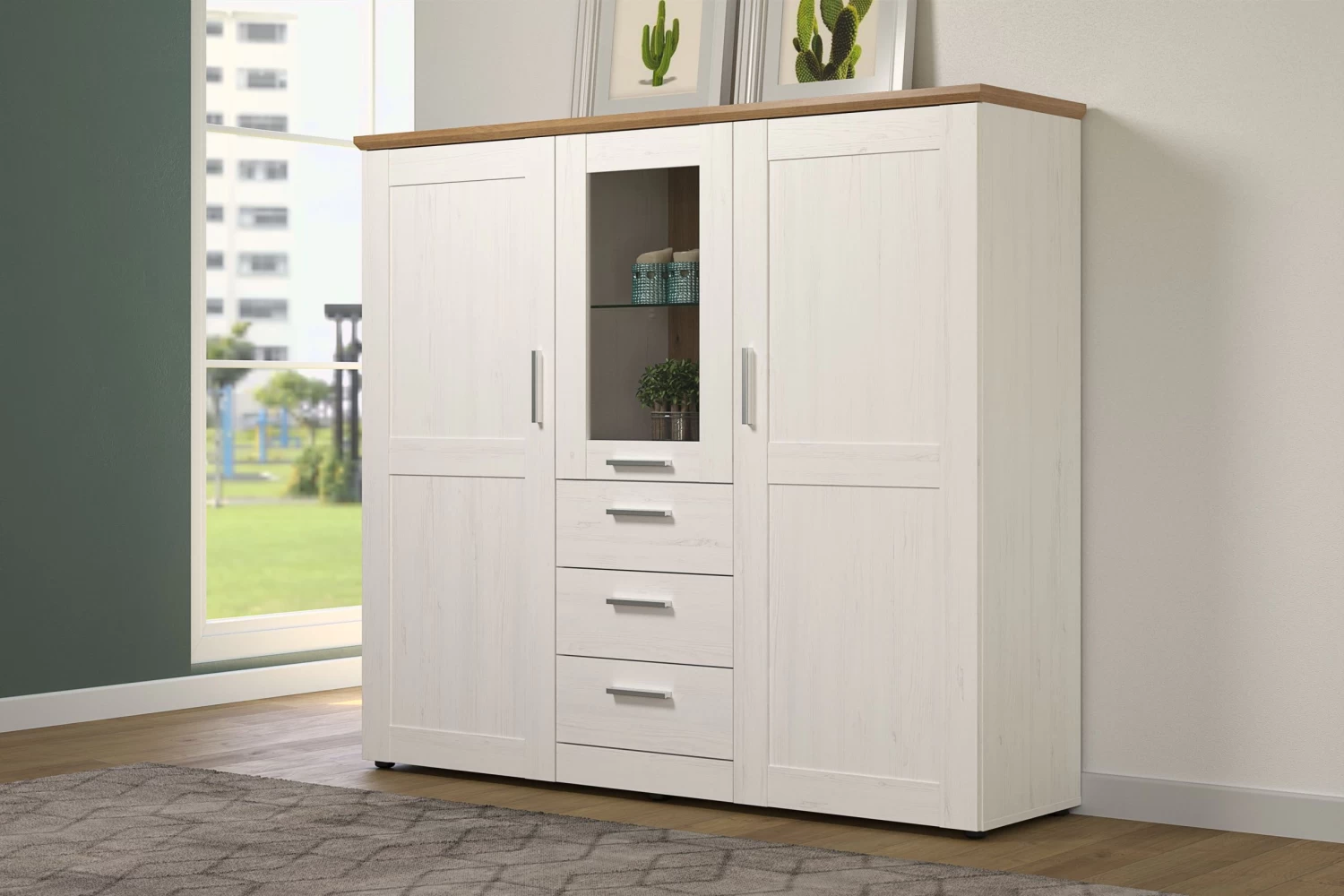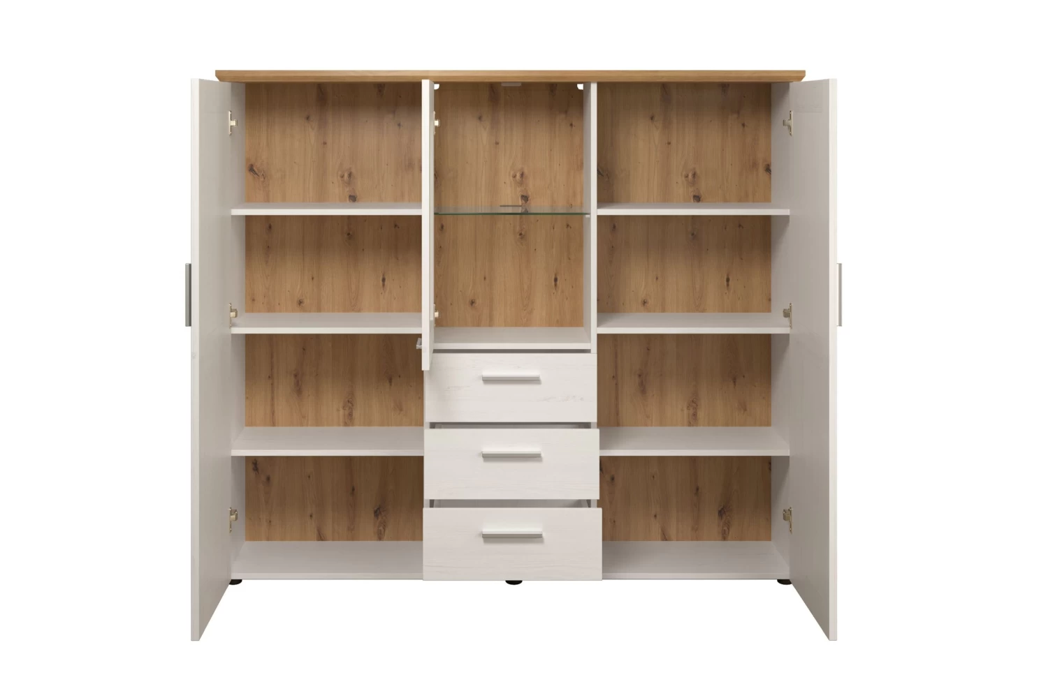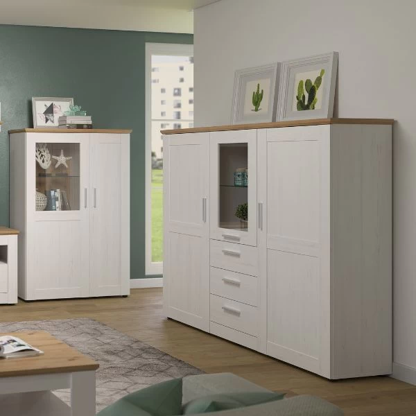 Deze hoge kast biedt veel opbergruimte met drie deuren, drie laden, vier legplanken en één glazen legplank. Je kunt je spullen gemakkelijk organiseren en uitstallen, zodat je leefruimte netjes en opgeruimd blijft.