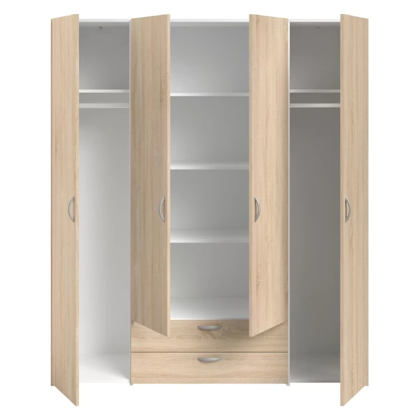 De Salvador collectie biedt tal van opbergmogelijkheden voor elk interieur. De kasten zijn vervaardigd uit spaanplaat met een sonoma eikdecor en hebben aluminiumkleurige handvaten. De kastdeuren beschikken bovendien over een soft-close systeem. Deze Salvador opbergkast telt vier deuren en twee lades. Binnenin is de kast uitgerust met twee kledingroedes en zes legplanken. De collectie Salvador is ook beschikbaar in wit.