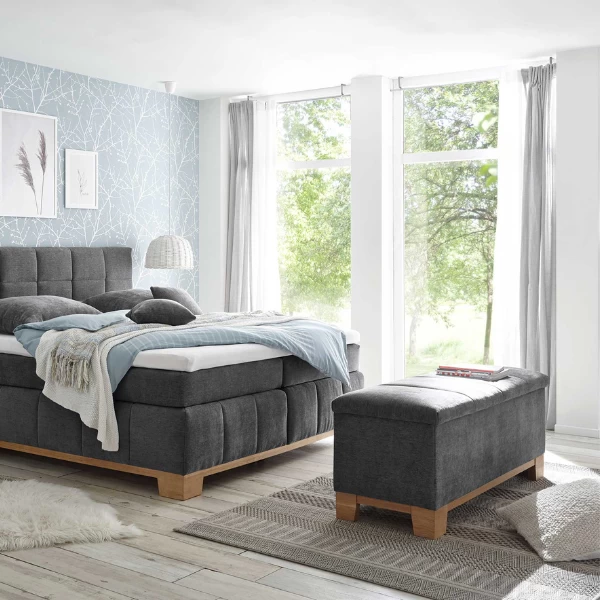 De combinatie van de zachte bekleding en de houten details zorgt ervoor dat de collectie Vikram perfect past in de Scandinavische woontrend. Deze opbergkoffer is gemaakt uit spaanplaat en is bekleed met grafietgrijs polyester. De eikenhouten pootjes zorgen voor een warm accent. De koffer biedt handige opbergruimte voor kussens, dekens of andere spullen. De zachte schuimvulling in het deksel zorgt ervoor dat je de koffer ook kunt gebruiken als extra zitplaats. Combineer hem met de boxsprings en nachttafeltjes Vikram in de slaapkamer, of gebruik hem als halbankje.
