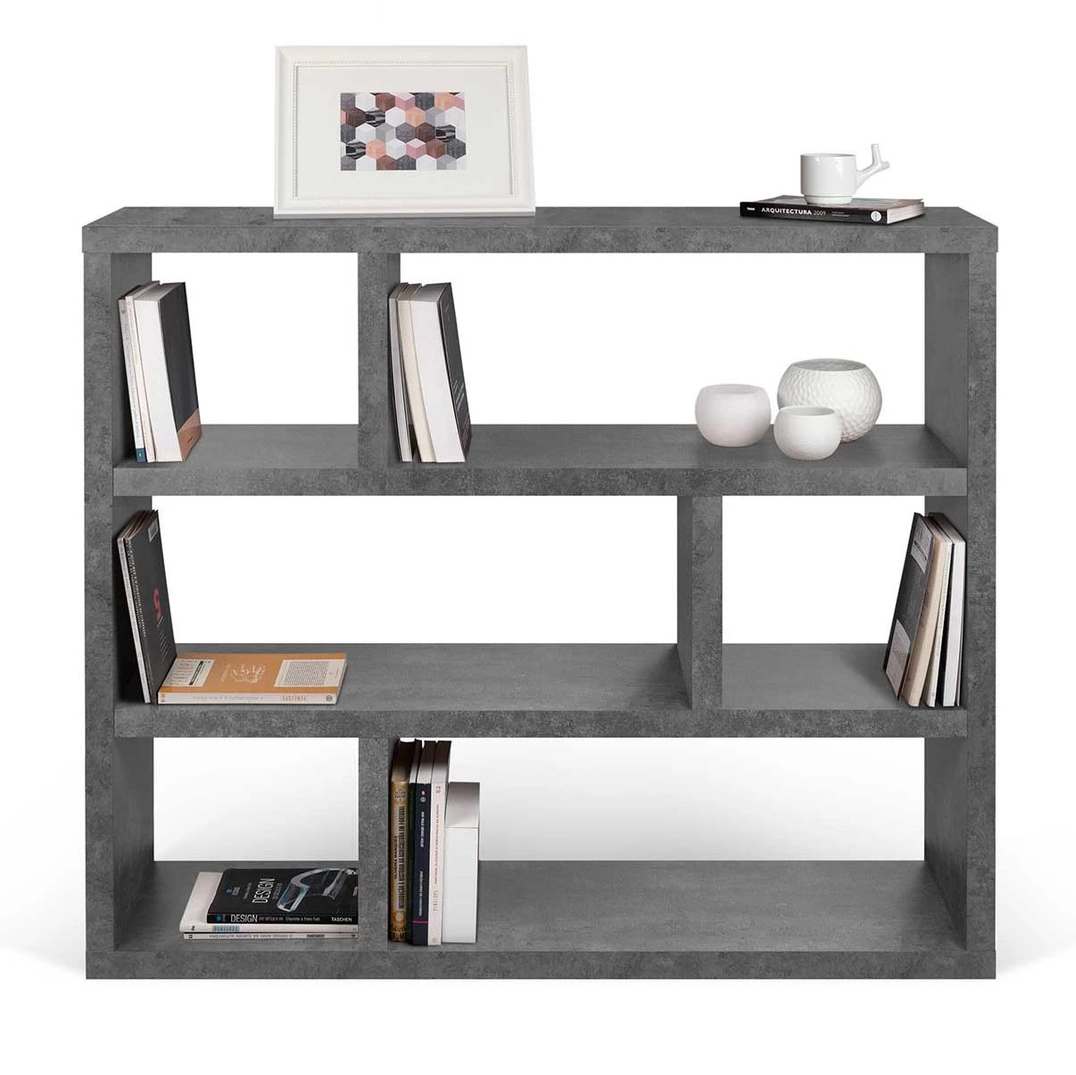 Opbergrek Dali zorgt niet alleen voor een plaatsje voor al jouw boeken, decoratie en andere toffe spullen, ze geeft de ruimte ook een stijlvolle uitstraling. Het rek beschikt over 3 grote en 3 kleine compartimenten en maakt zich al snel onmisbaar in jouw interieur. Het afwisselende geometrische patroon geeft extra cachet aan jouw interieur. Opbergrek Dali is gemaakt van MDF en is afgewerkt met een laagje melamine met betonlook.
